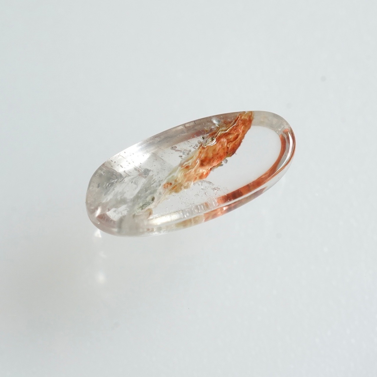 透明感の中に、燃えるような赤いアンフィボール(角閃石)が一本筋のように走る、洗練された雰囲気のアンフィボール in クォーツカボションです。