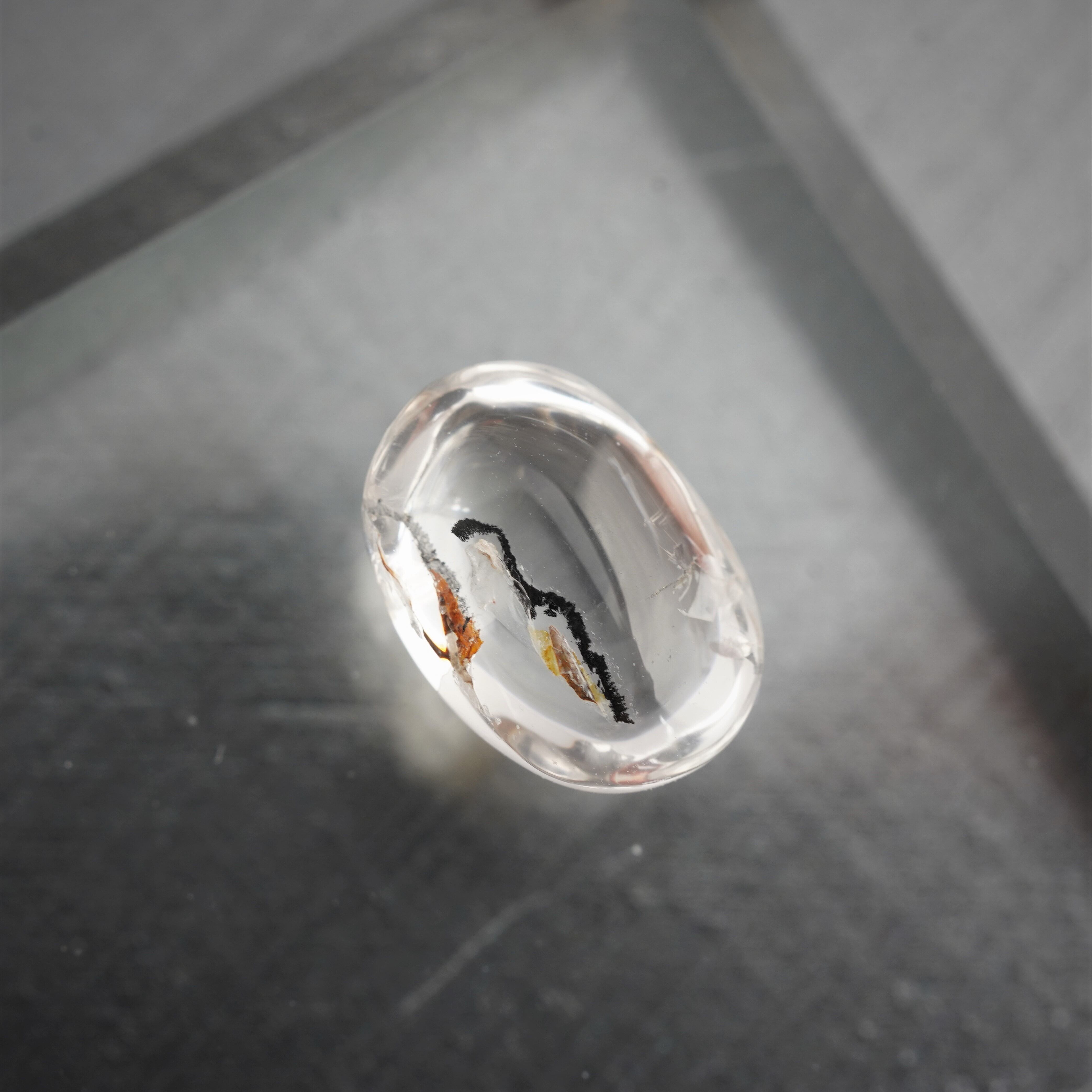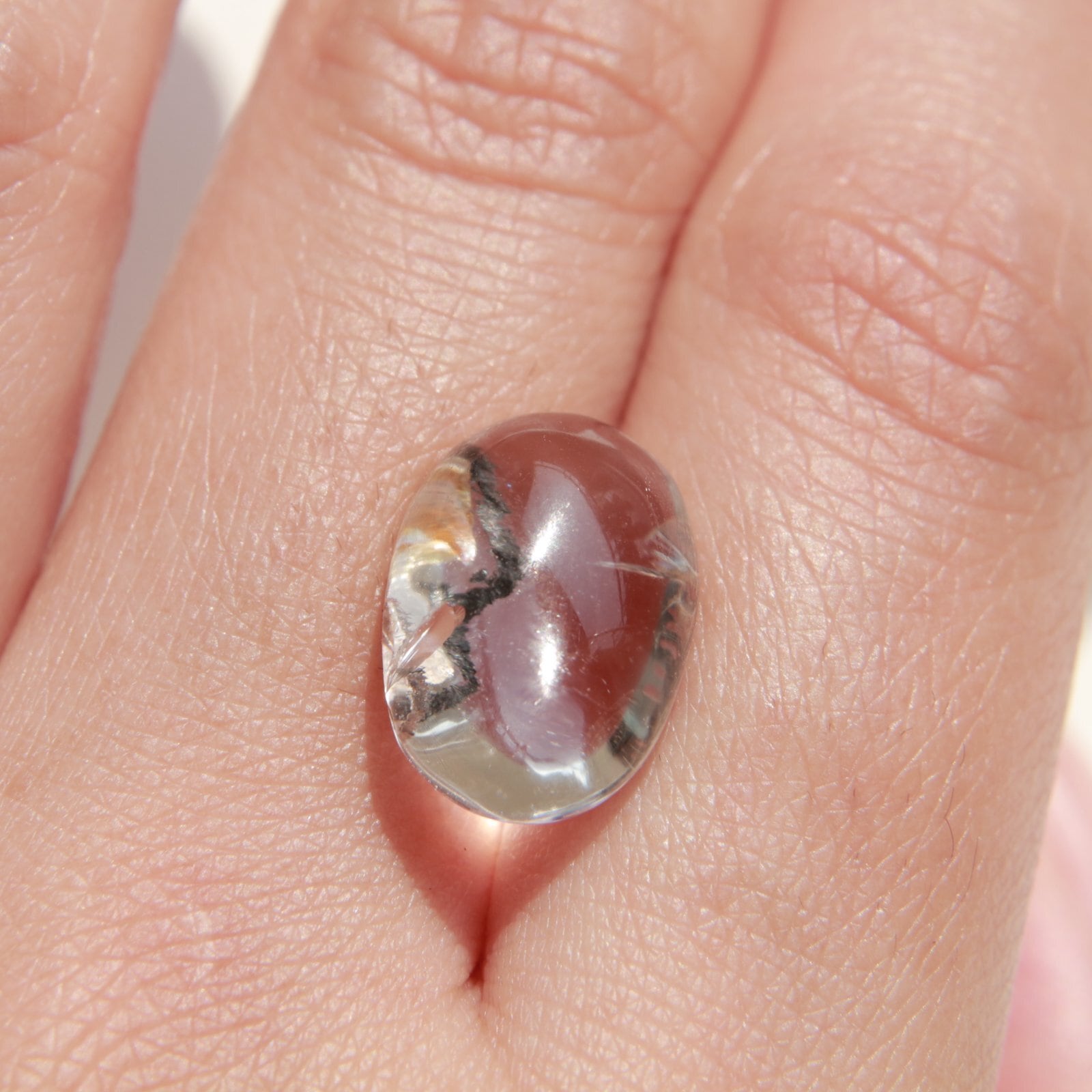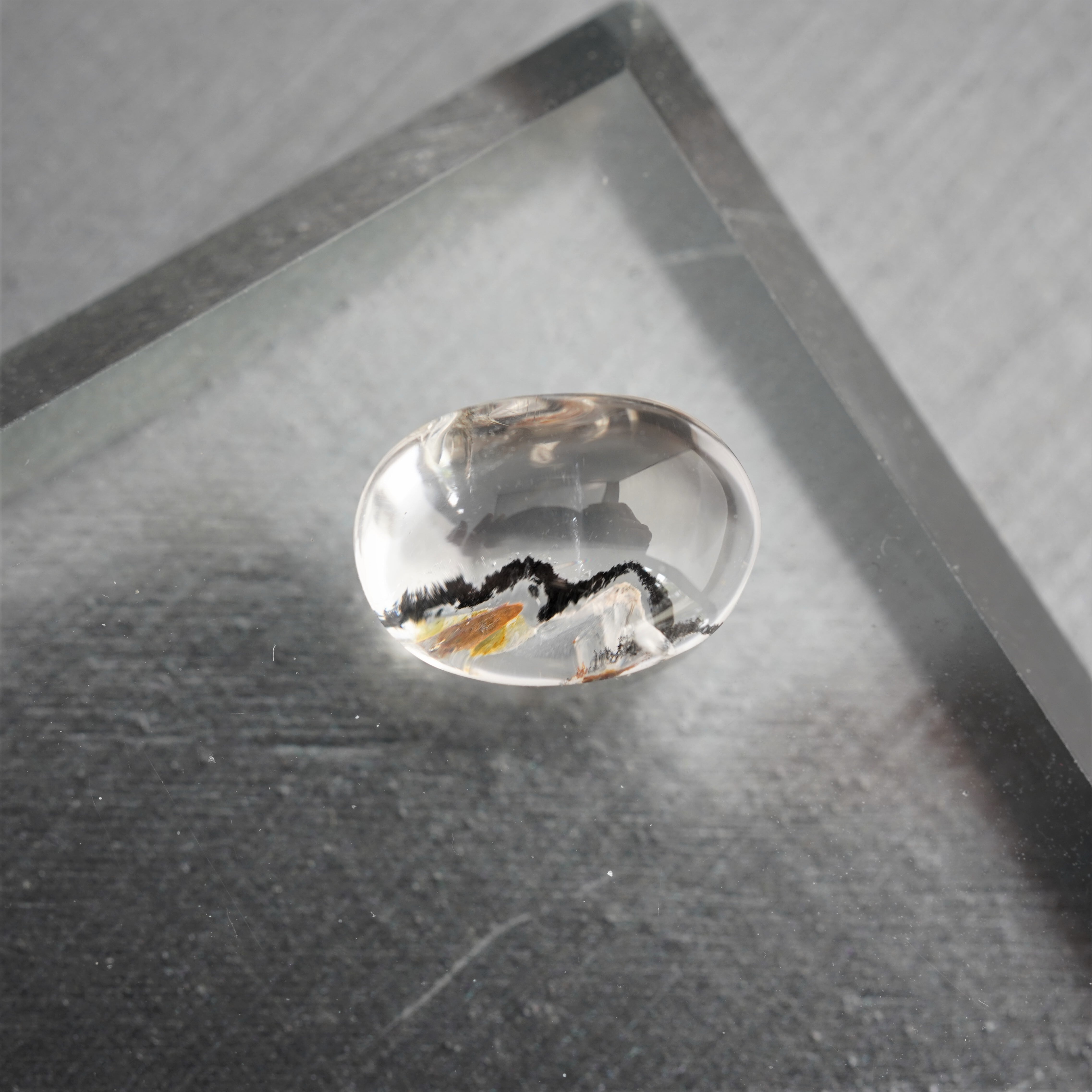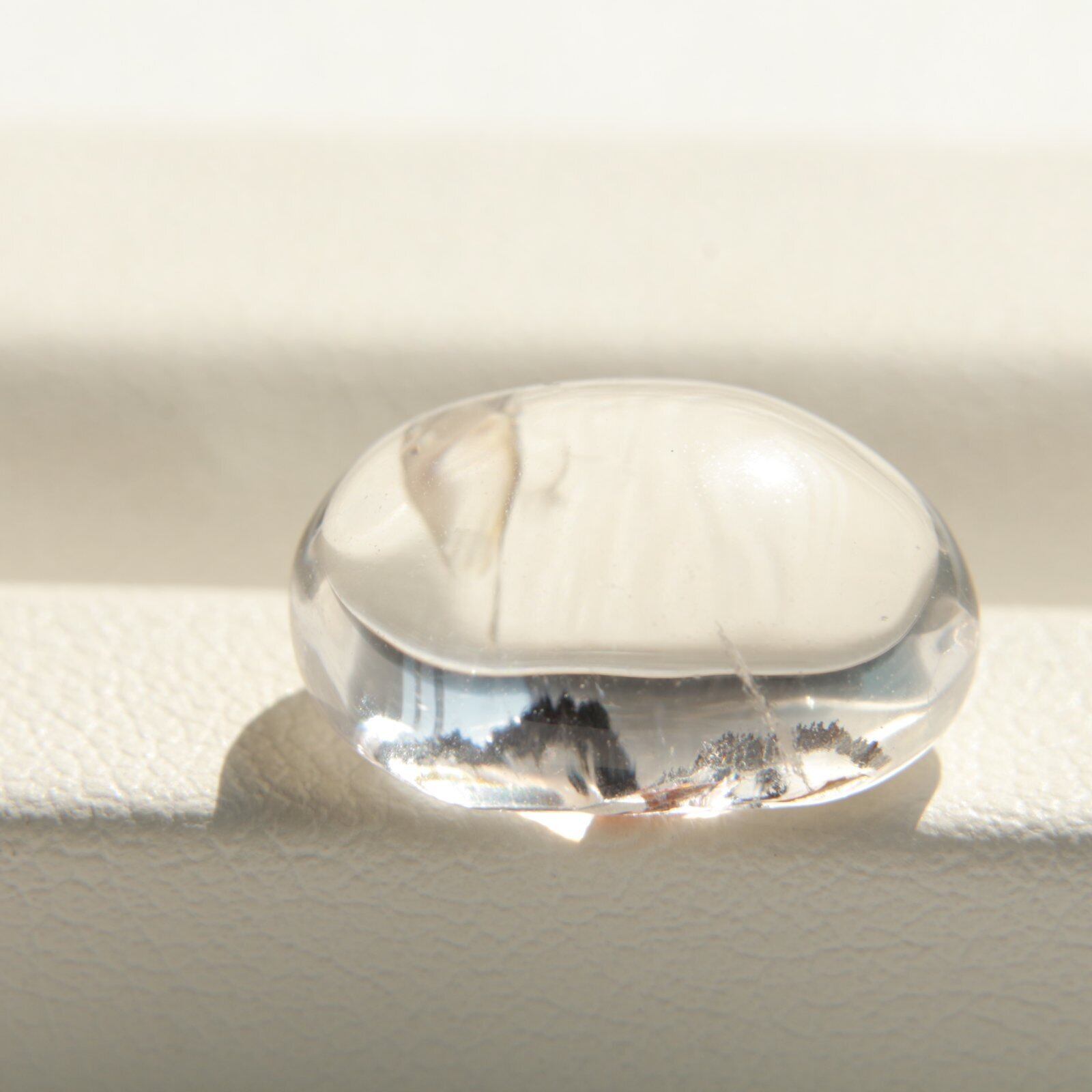 透明度の高い水晶の内部に、個性的なインクルージョン(内包物)が美しく広がるカボションルースです。黒やブラウンのラインが描く模様は、まるで風景画のような幻想的な世界を感じさせます。