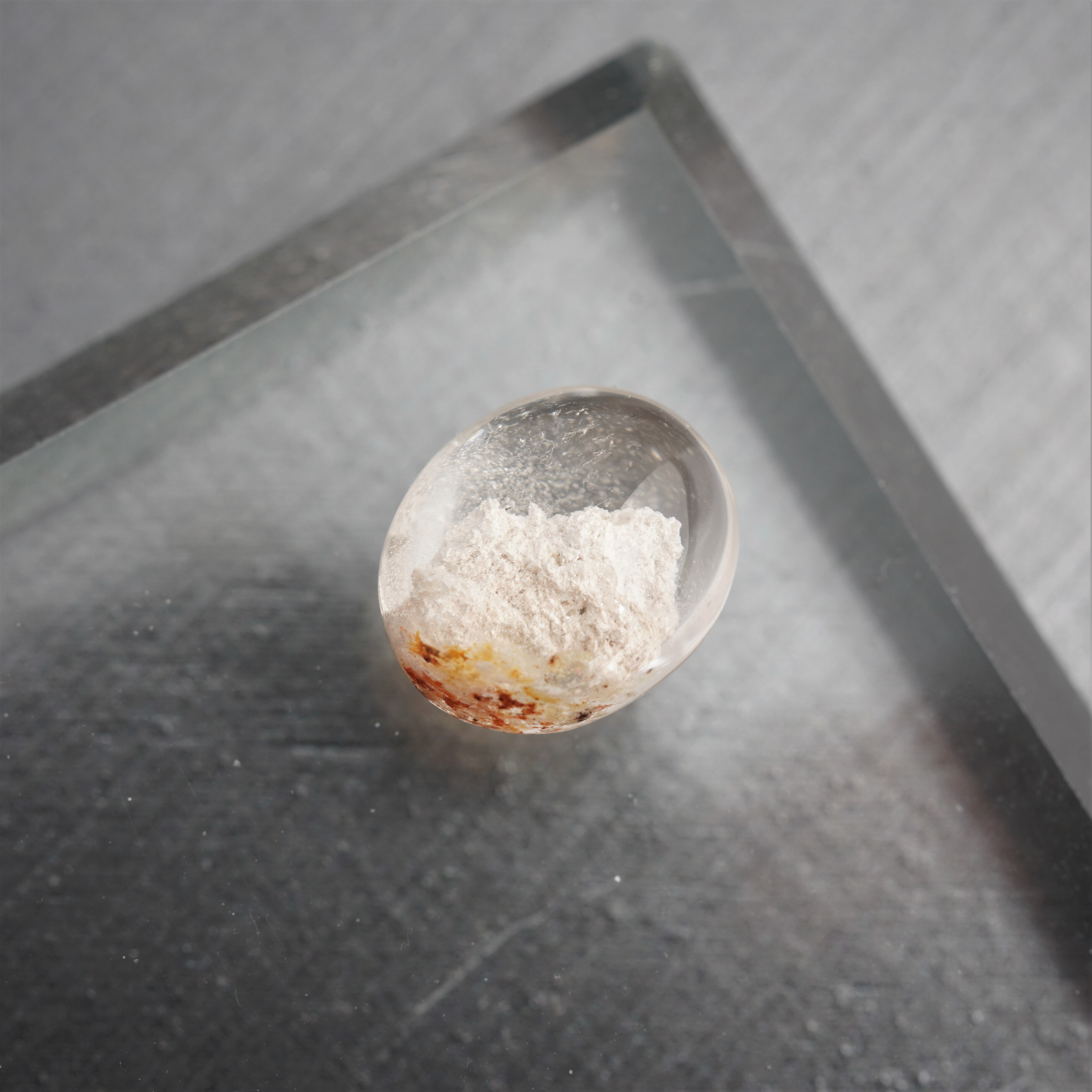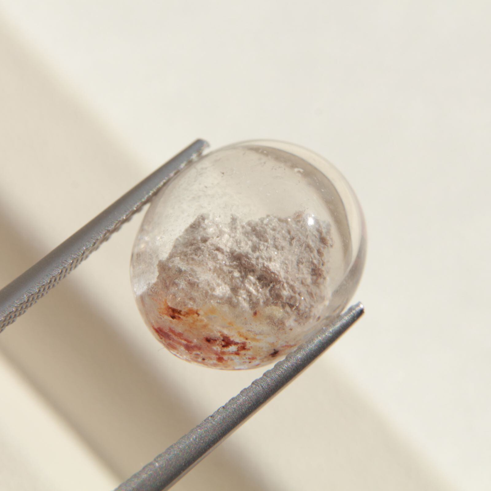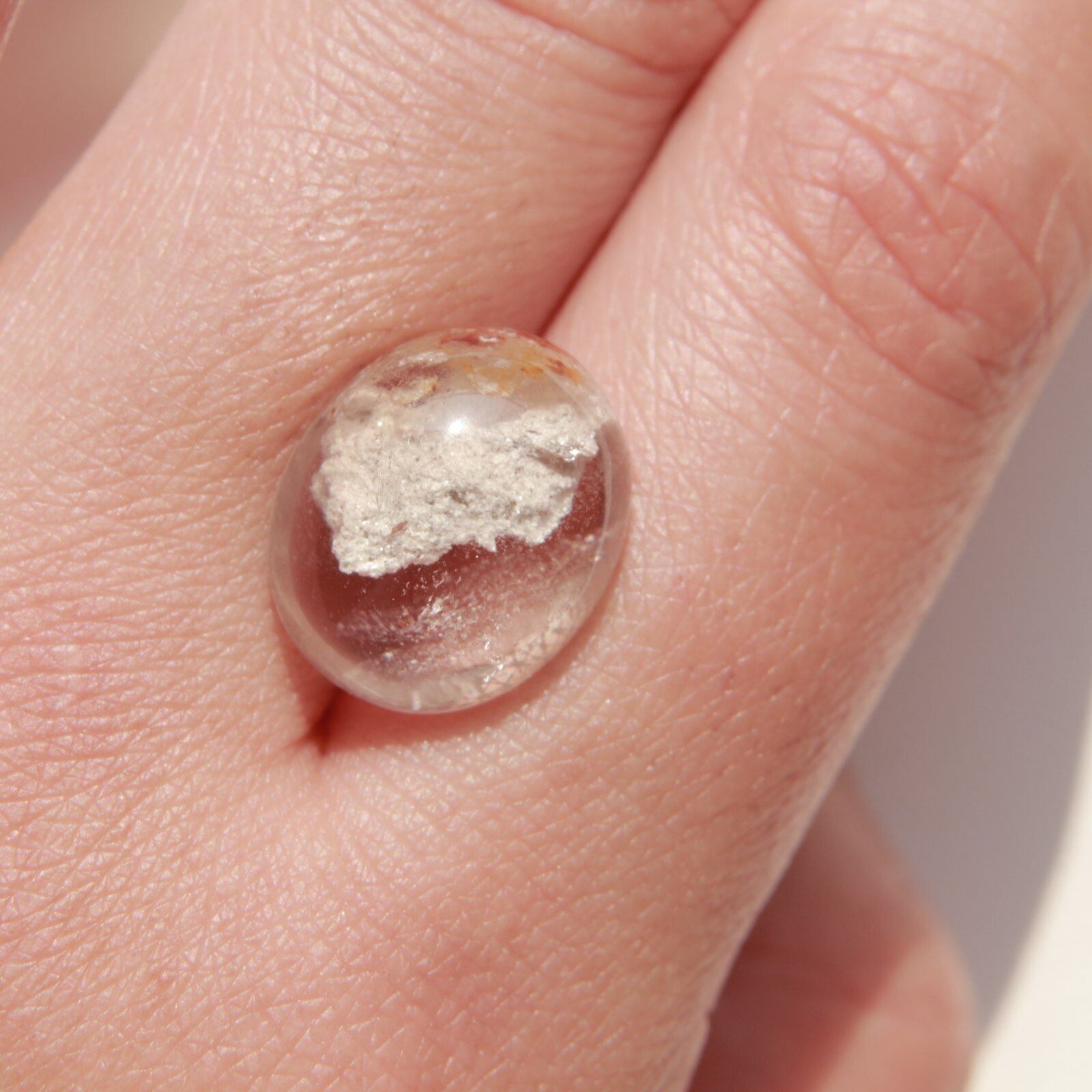 透明感のある水晶の内部に、白くやわらかな内包物が広がる美しい「ホワイトガーデンクォーツ」のカボションルースです。まるで雪景色や雲のような幻想的な風景が閉じ込められており、静かで優しい印象を与えてくれます。