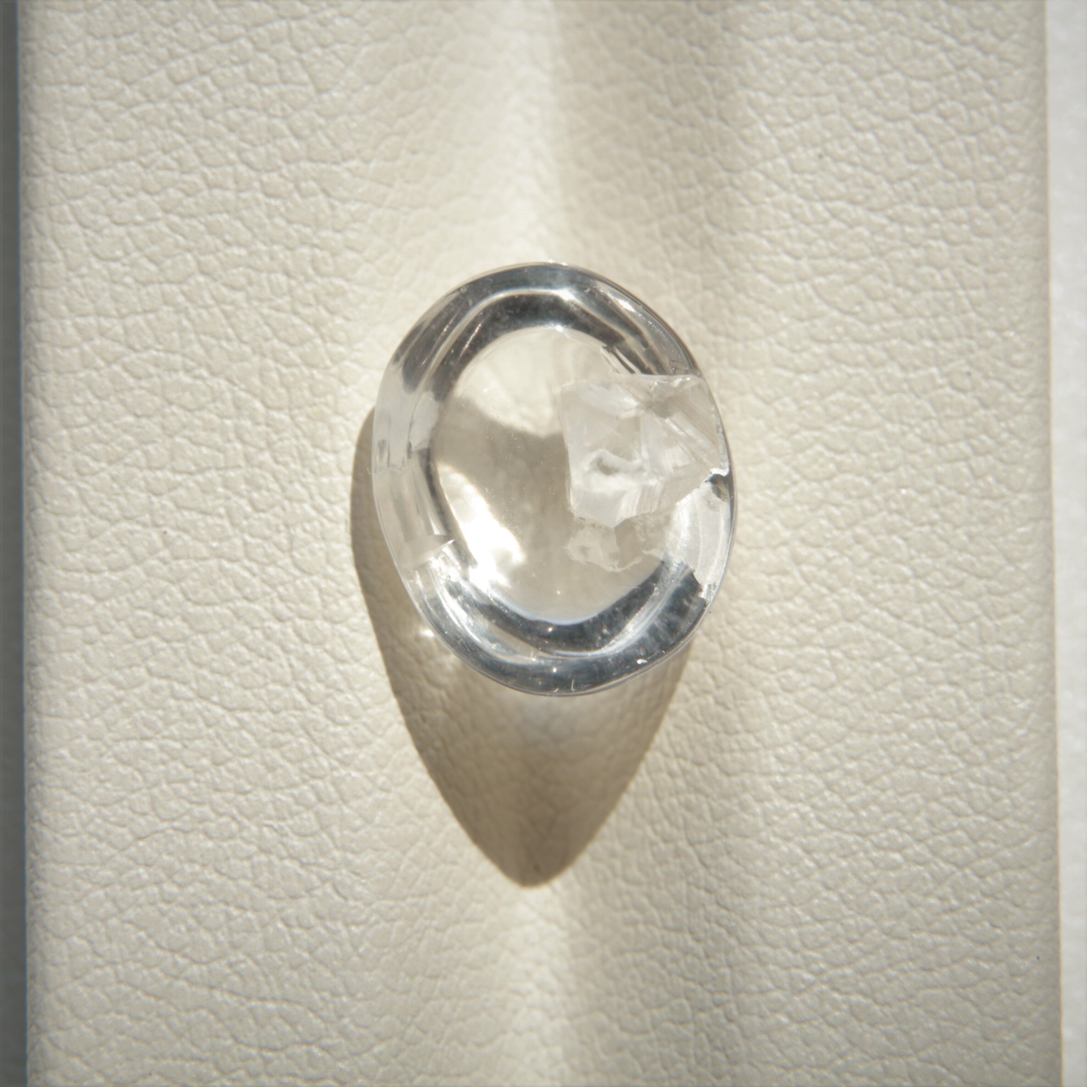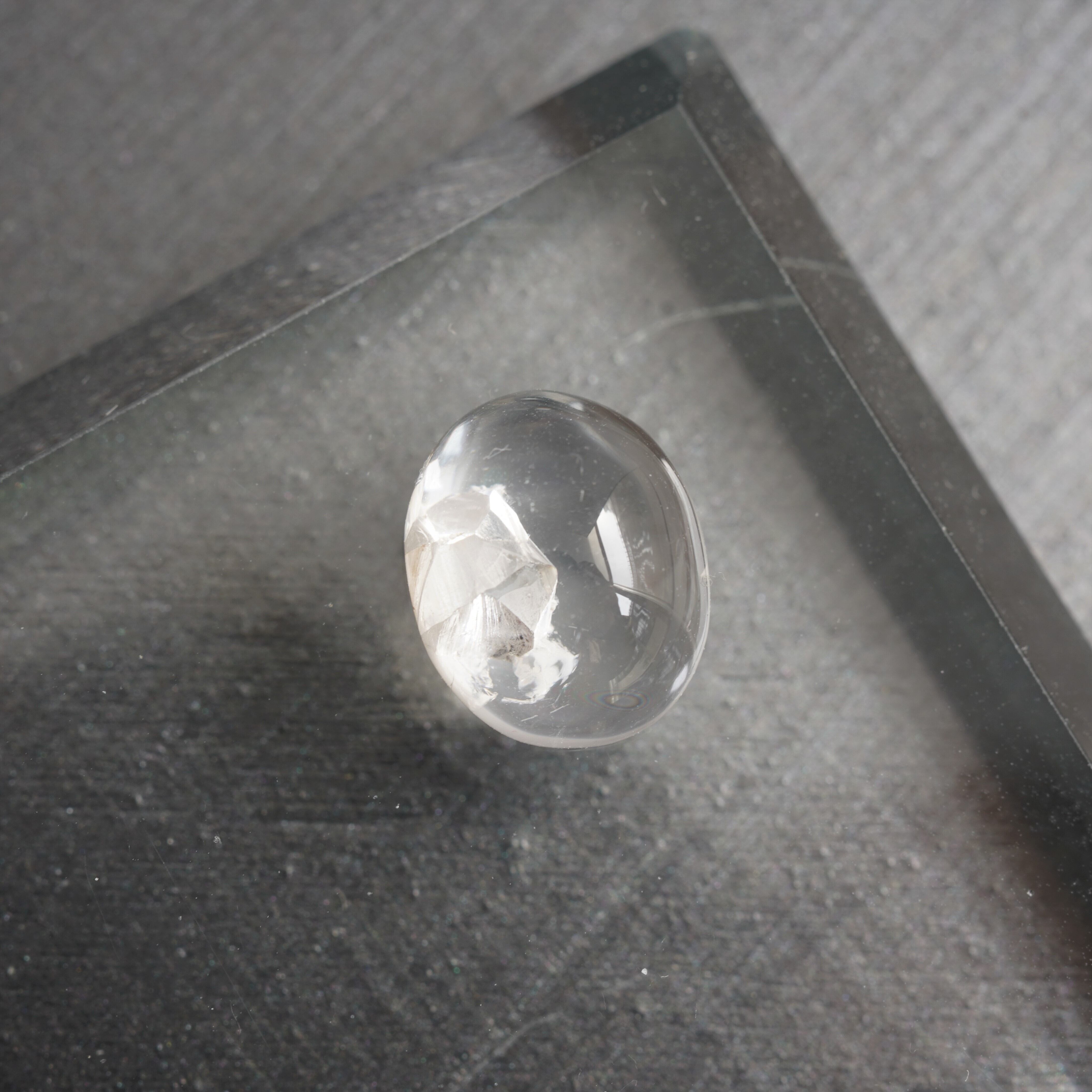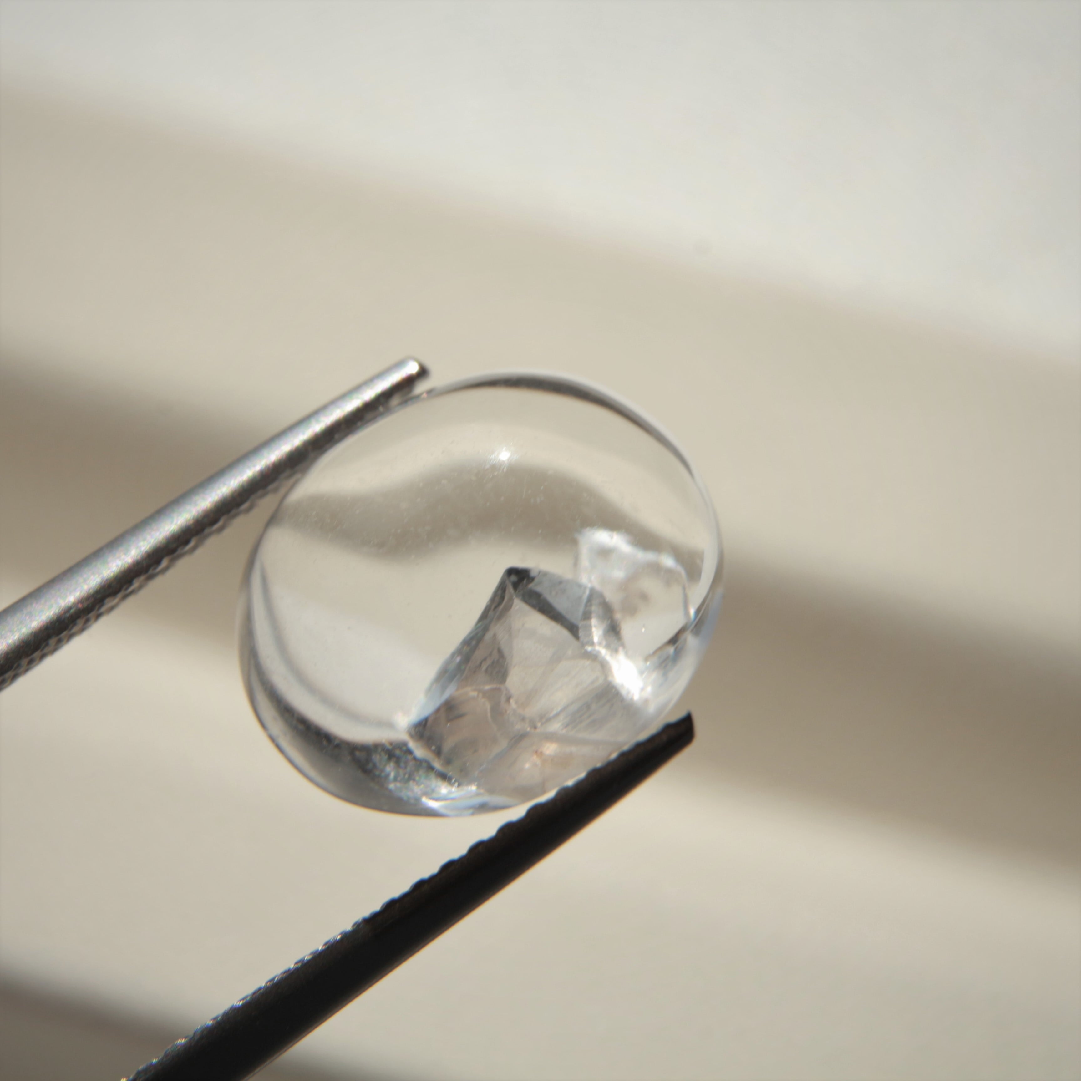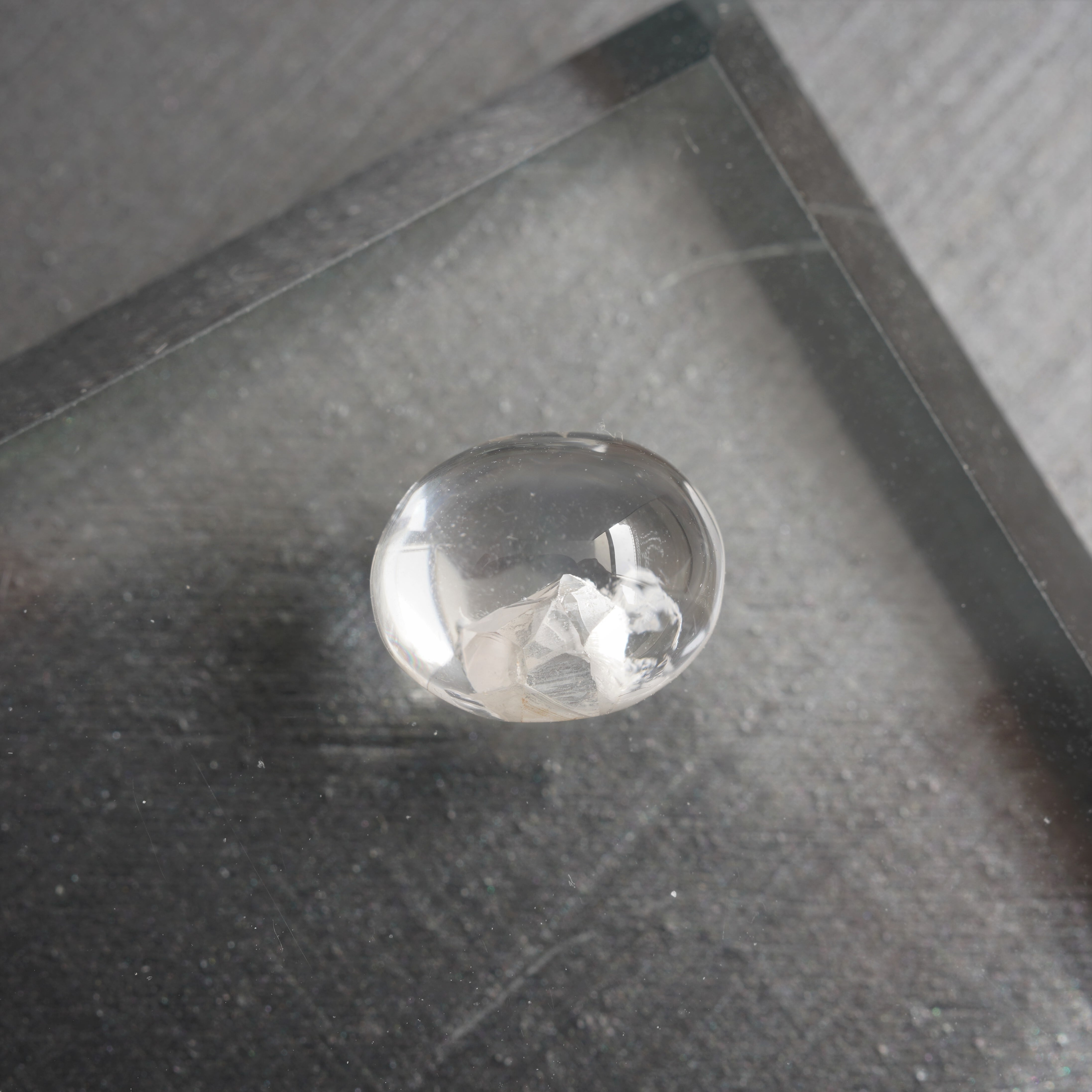 透明感のある水晶の中に、もう一つの水晶が内包された神秘的な「クォーツ in クォーツ」のカボションルースです。内側に浮かぶ結晶が奥行きのある美しさを生み出し、見る角度によって異なる表情を楽しめます。