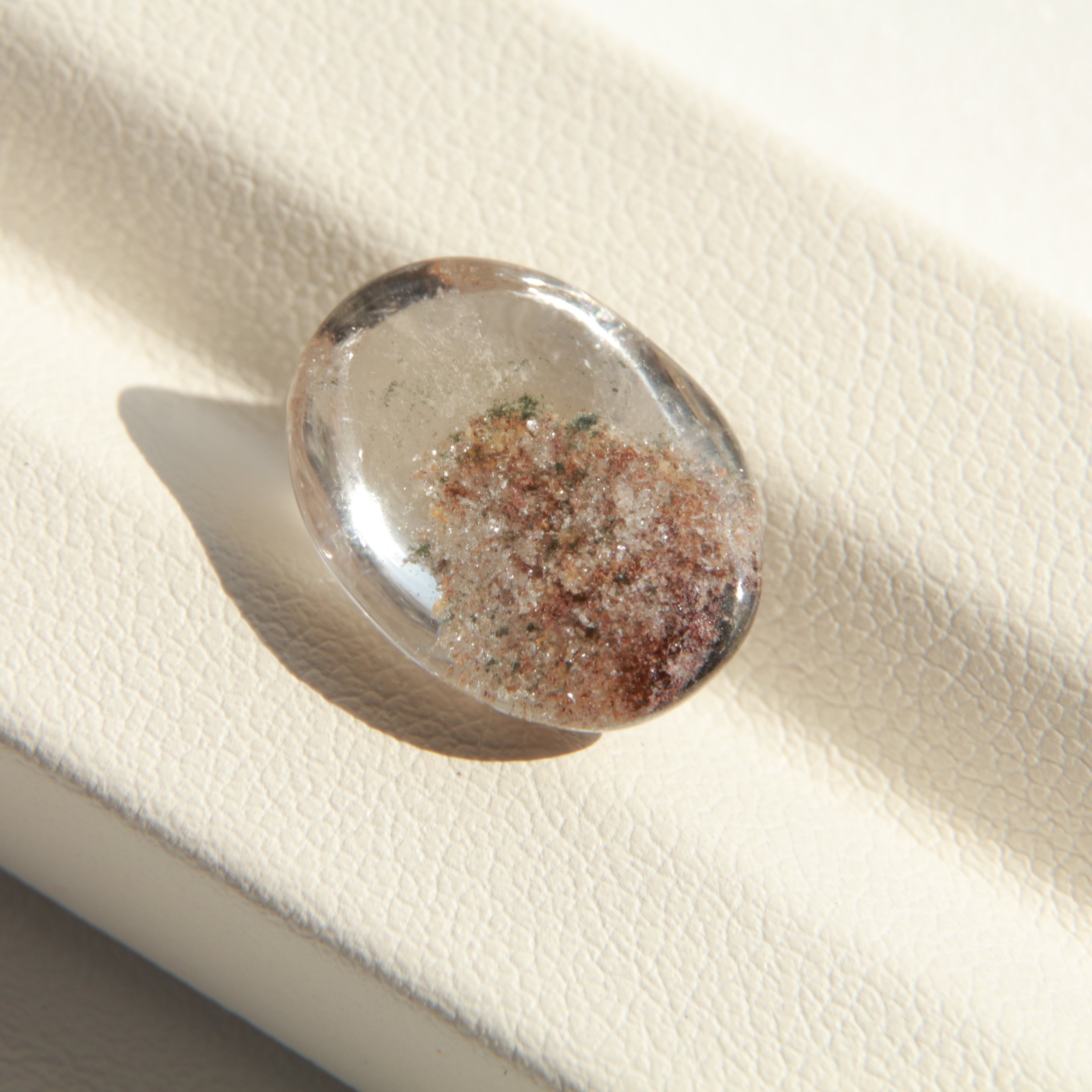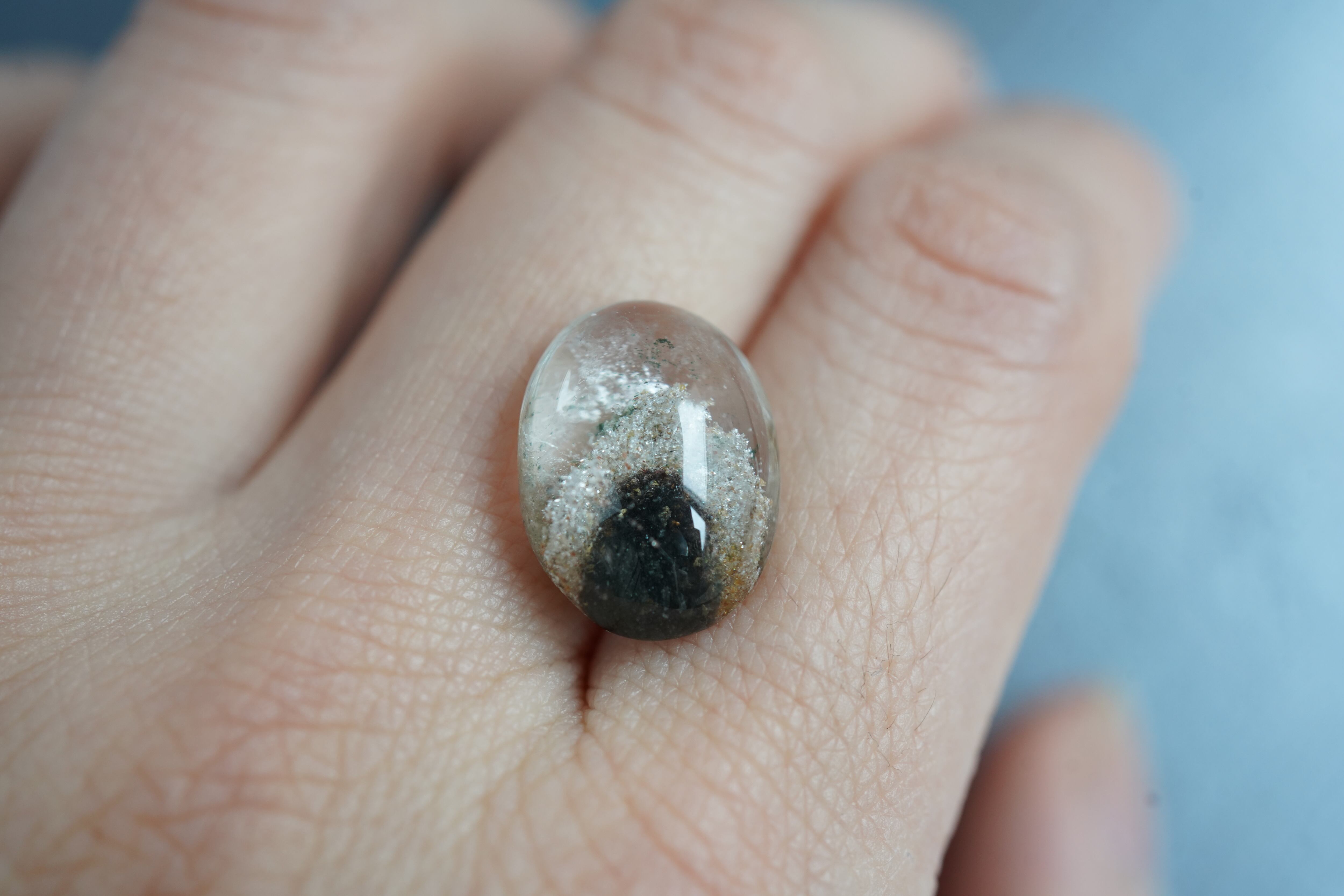 丸みを帯びたカボションカットにより、内部の景色がより立体的に見え、光の当たり方によって表情が変化します。