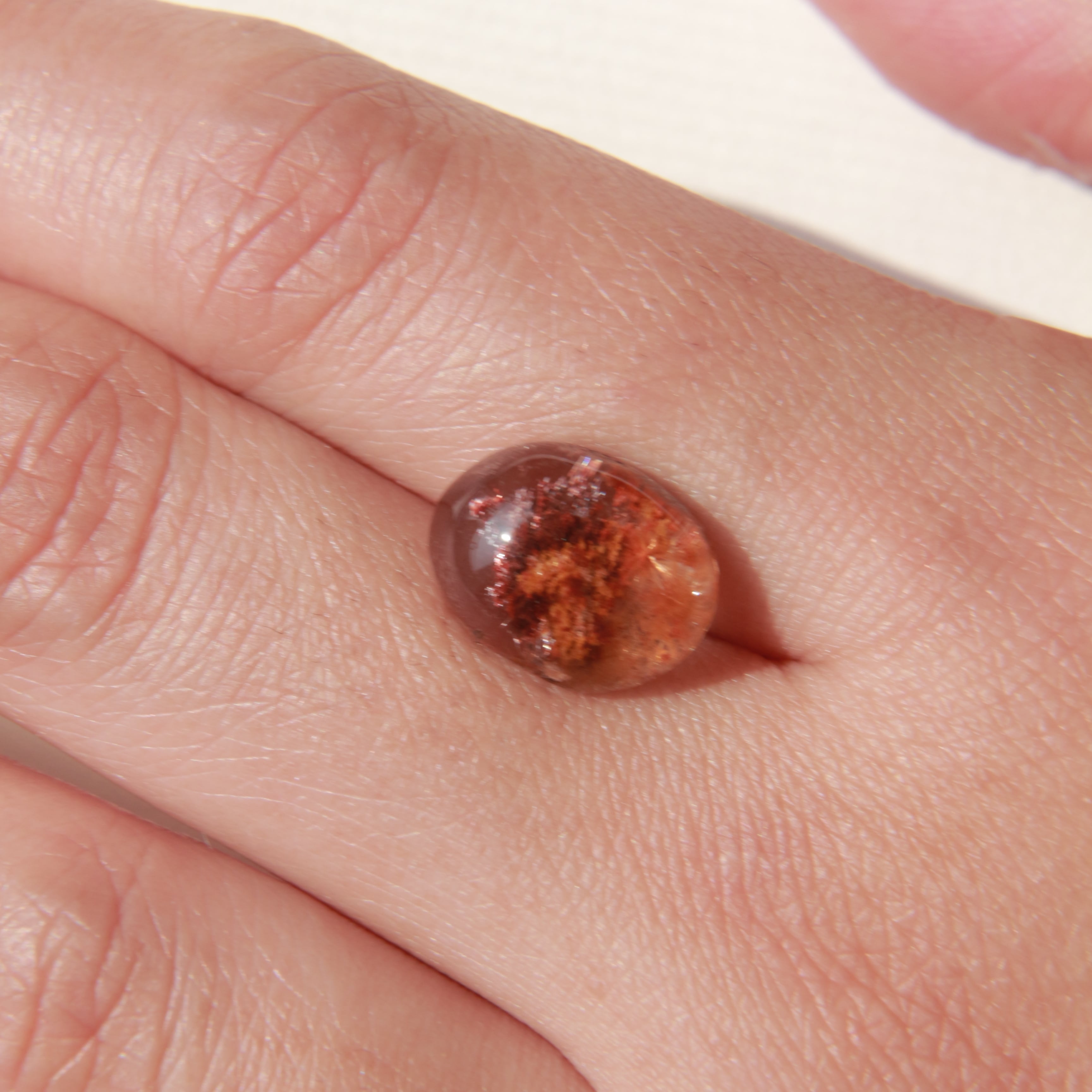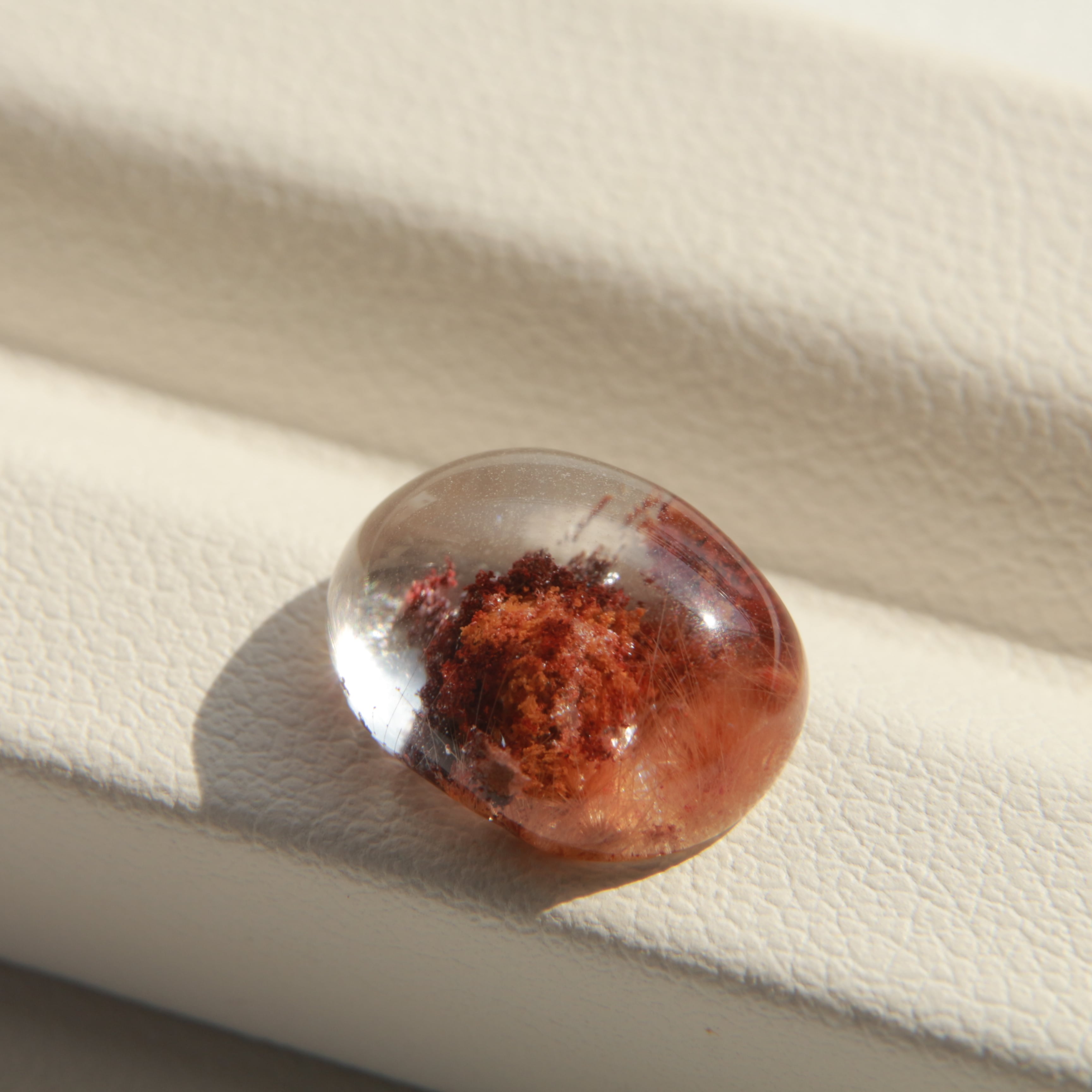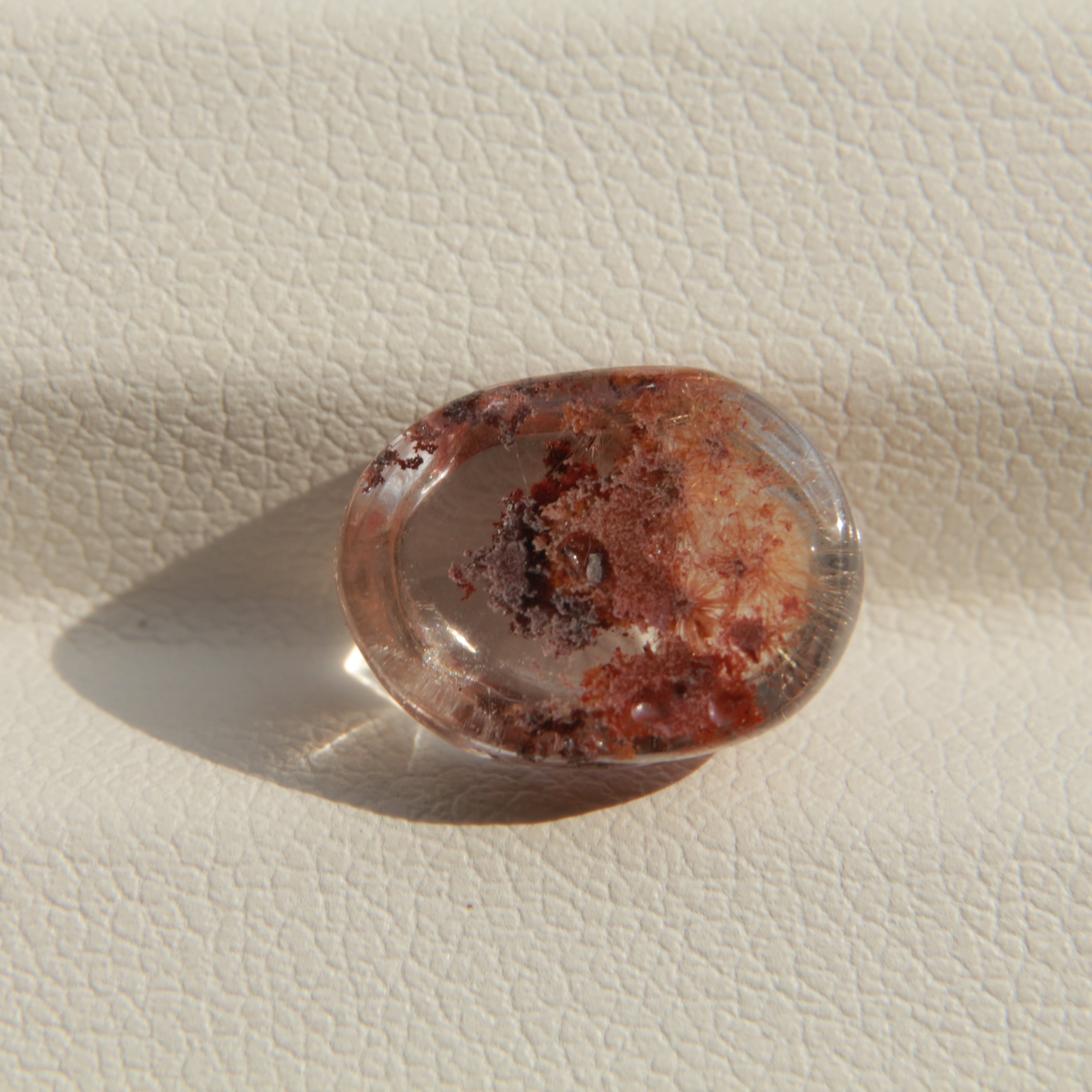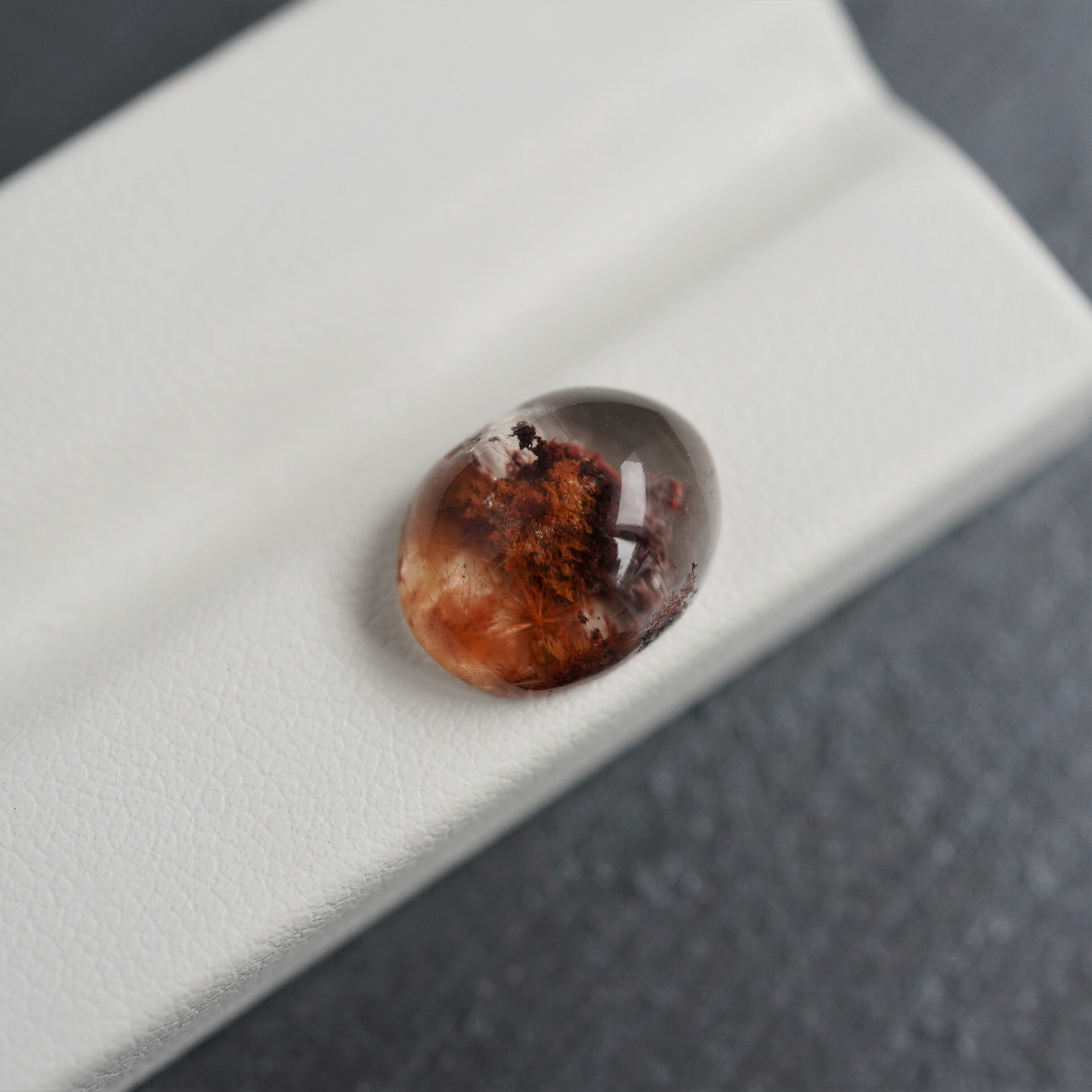 透明感のあるクォーツの内部に、赤褐色のインクルージョンが豊かに広がるガーデンクォーツのカボションルースです。内包物はまるで秋の森や大地の景色を思わせるような表情を見せ、自然が創り出したアートのような一石となっています。