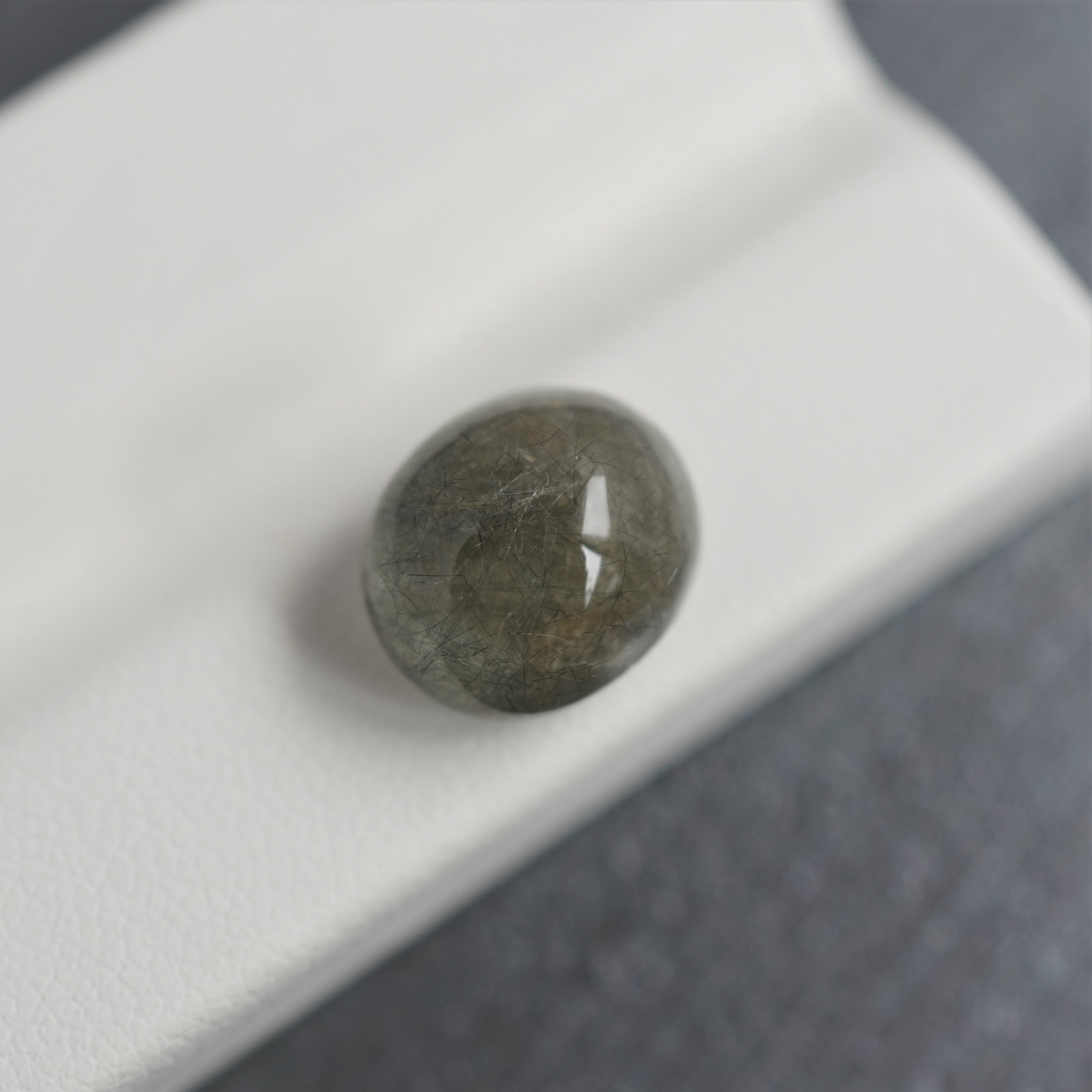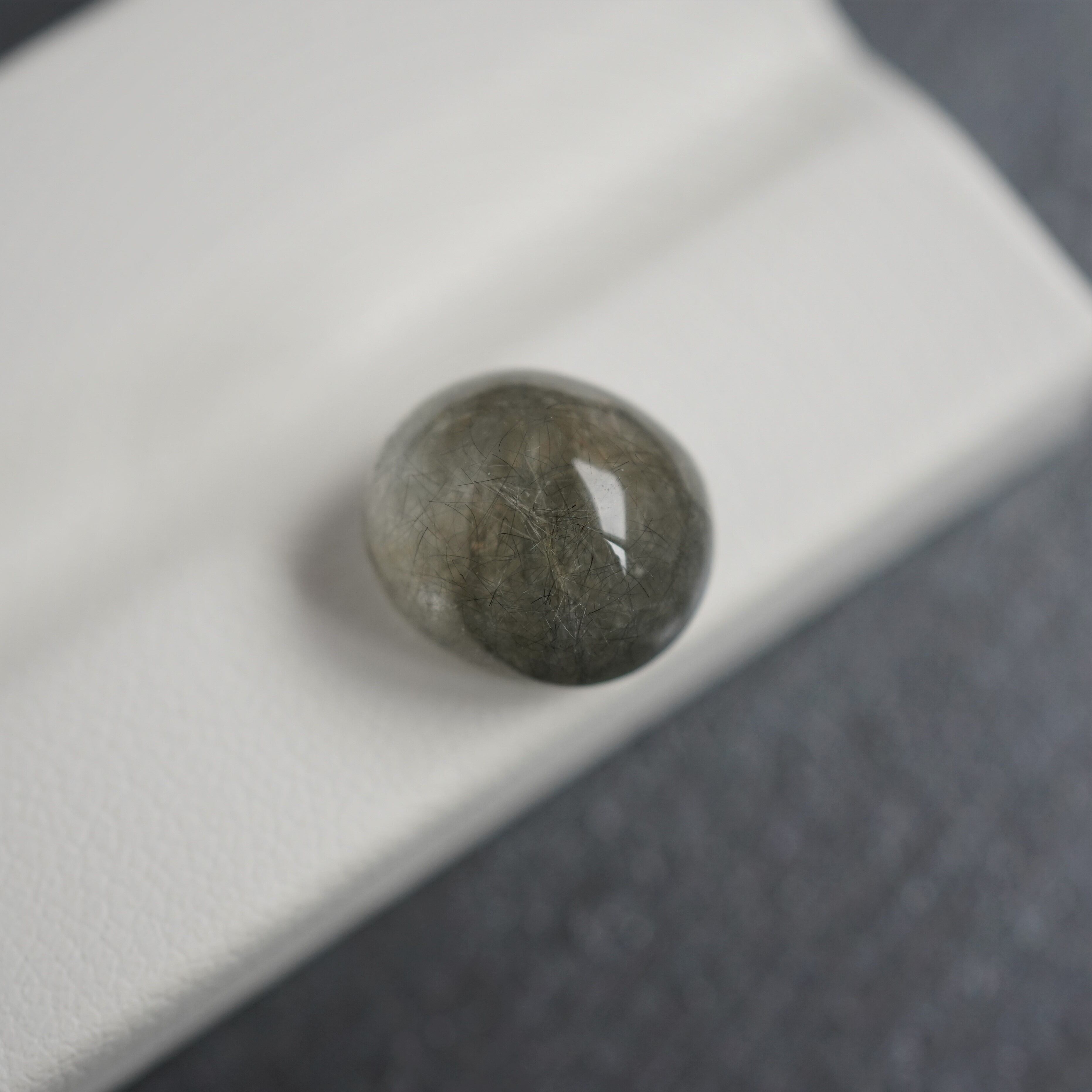 内部に広がる繊細なインクルージョンは層や流れを感じさせ、見る角度や光の加減によって異なる表情を楽しめるのが魅力です。カボションカットによって、その奥行きと立体感がより引き立ち、しっとりとした艶感が石の美しさを際立たせます。