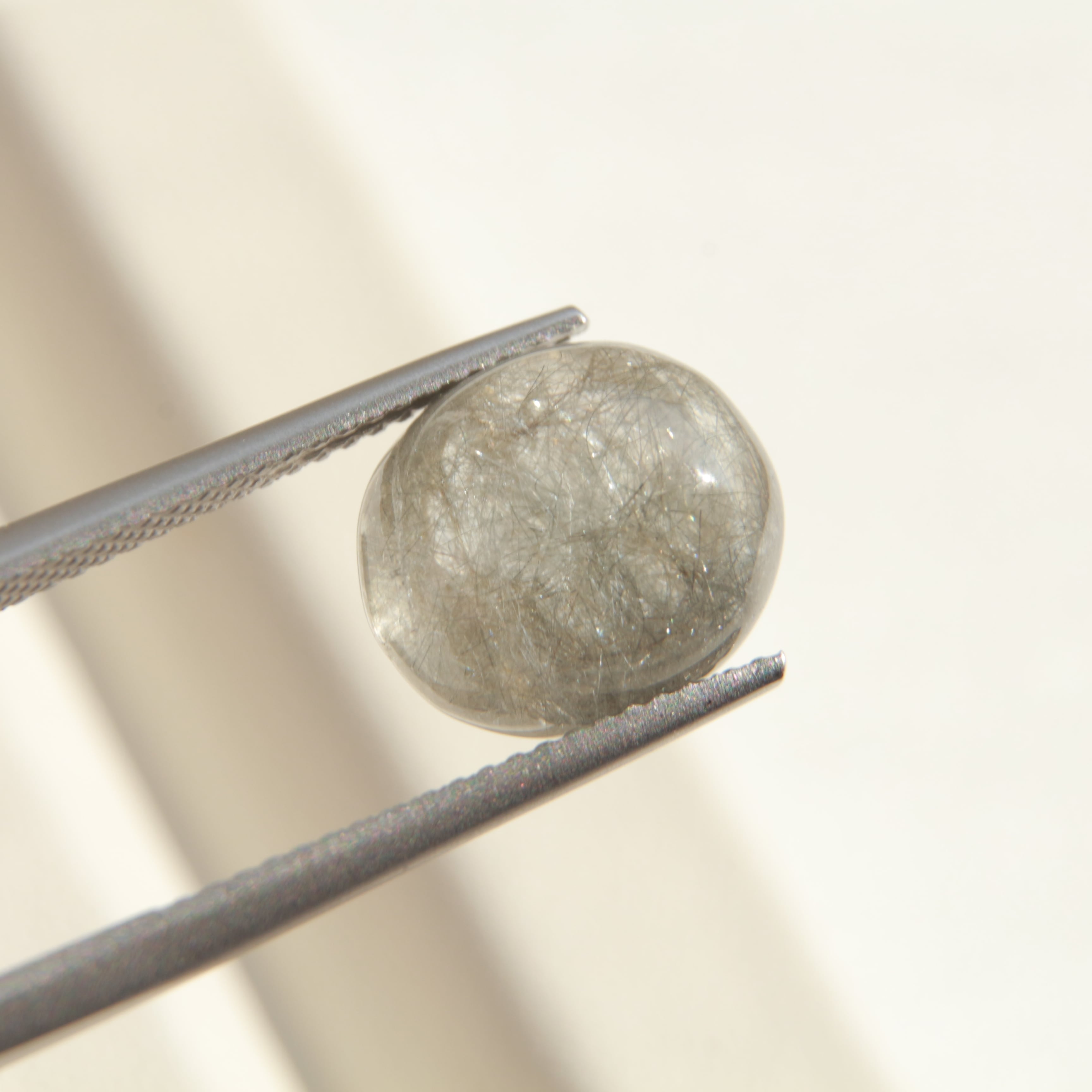 透明感のあるクォーツの内部に、グレーブルーのアンフィボールインクルージョンが漂う神秘的なカボションルースです。落ち着いた深みのある色合いは、まるで霧がかった湖や静かな水中の景色を閉じ込めたかのような幻想的な印象を与えます。