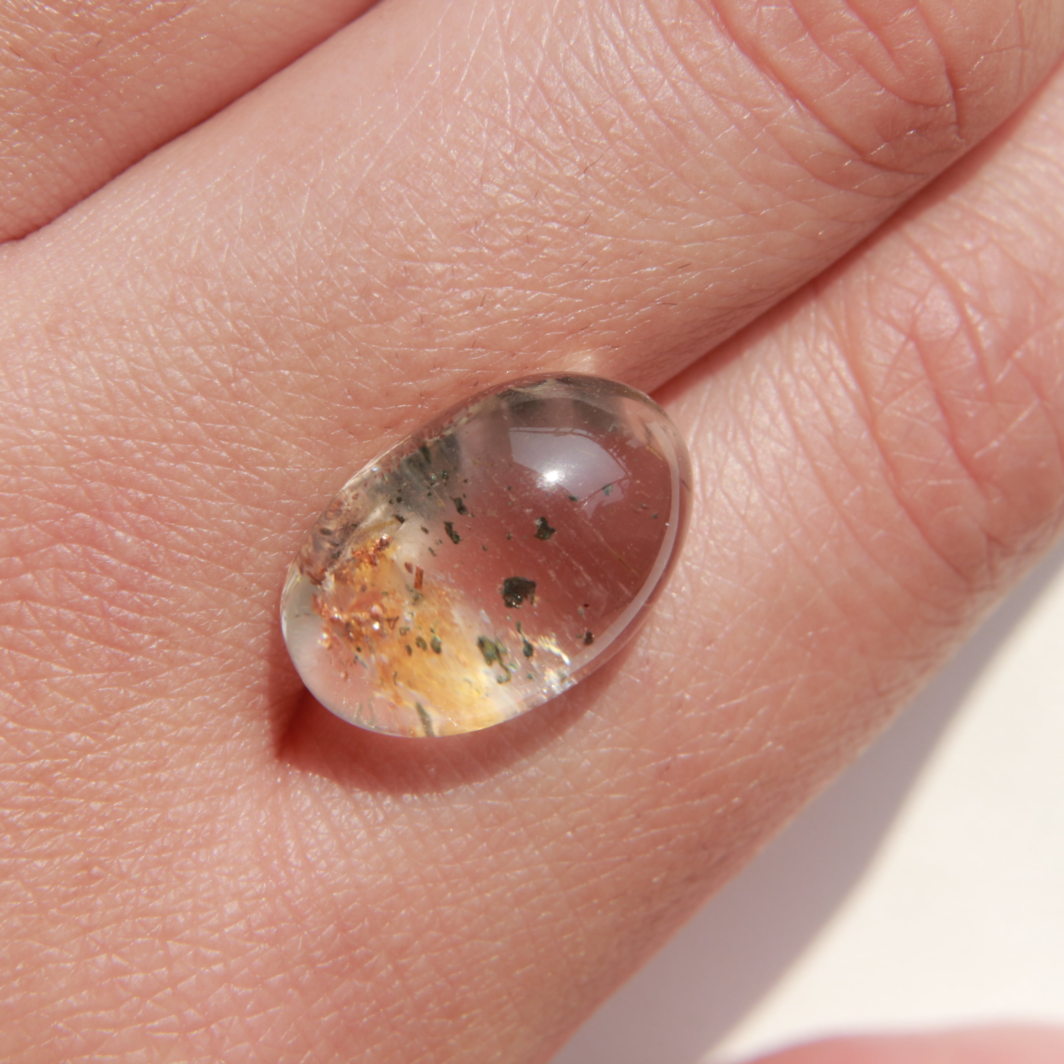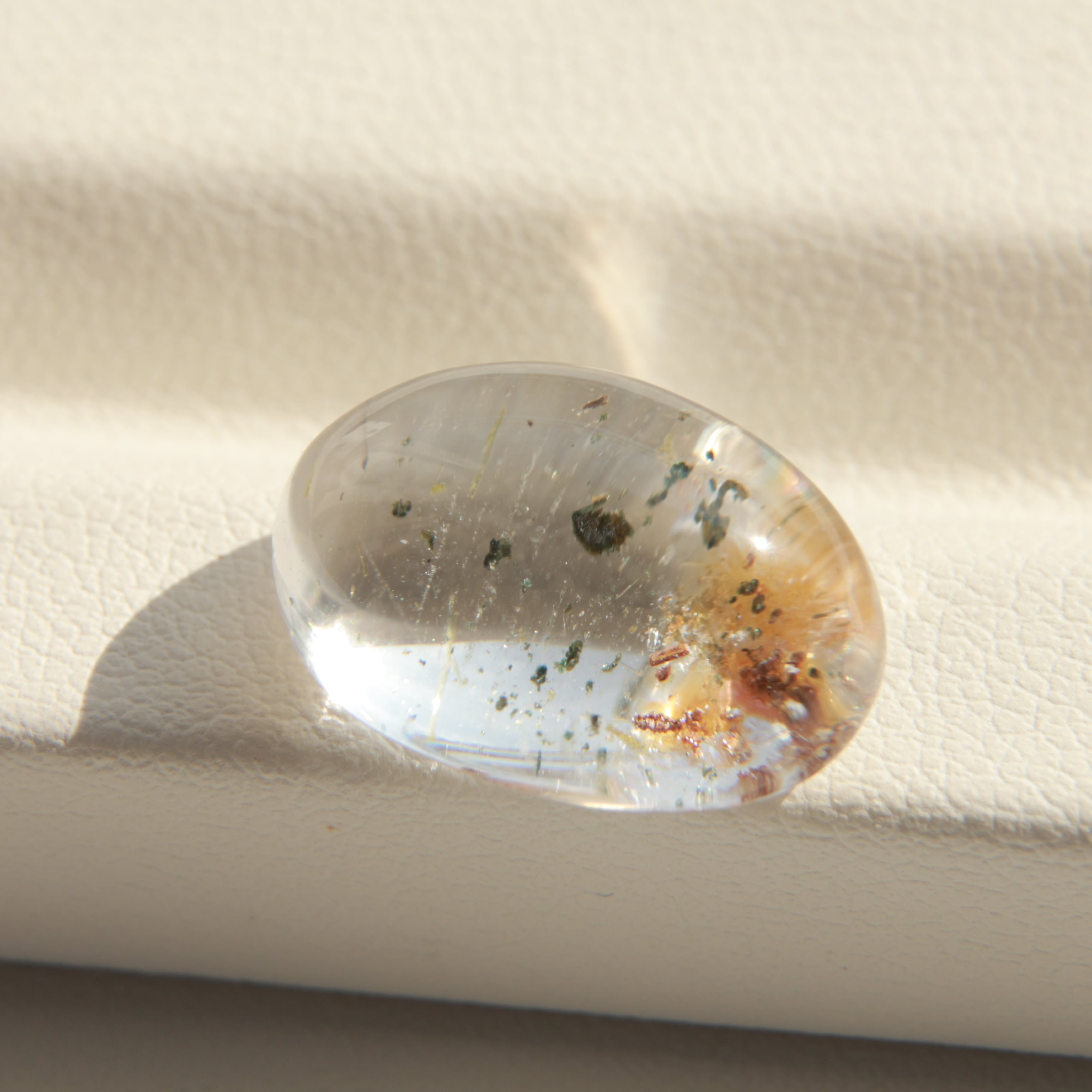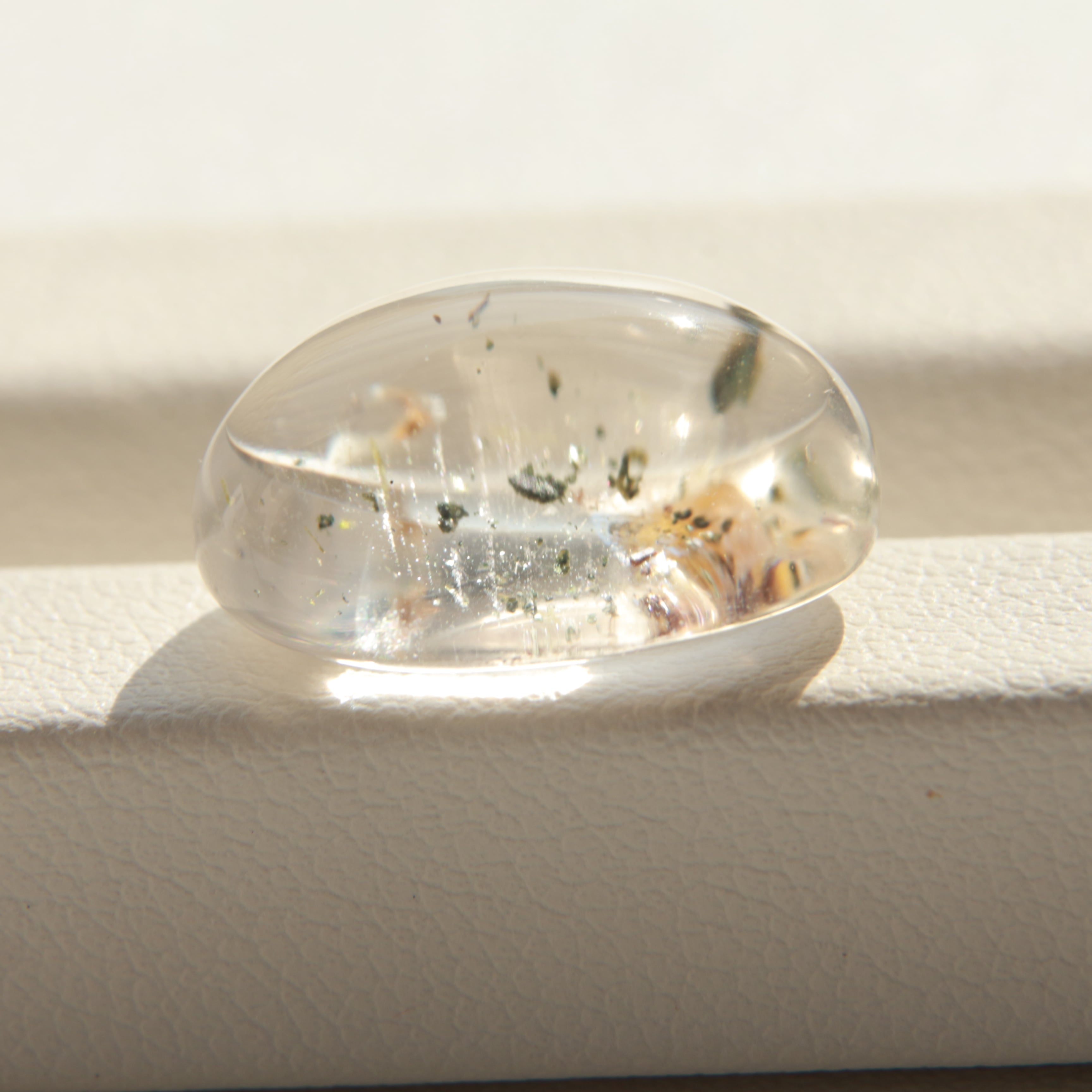 透明感のあるクォーツに、軽やかな印象の内包物がやさしく広がるカボションルースです。全体的にあっさりとしたクリアな雰囲気で、すっきりとした美しさが魅力。