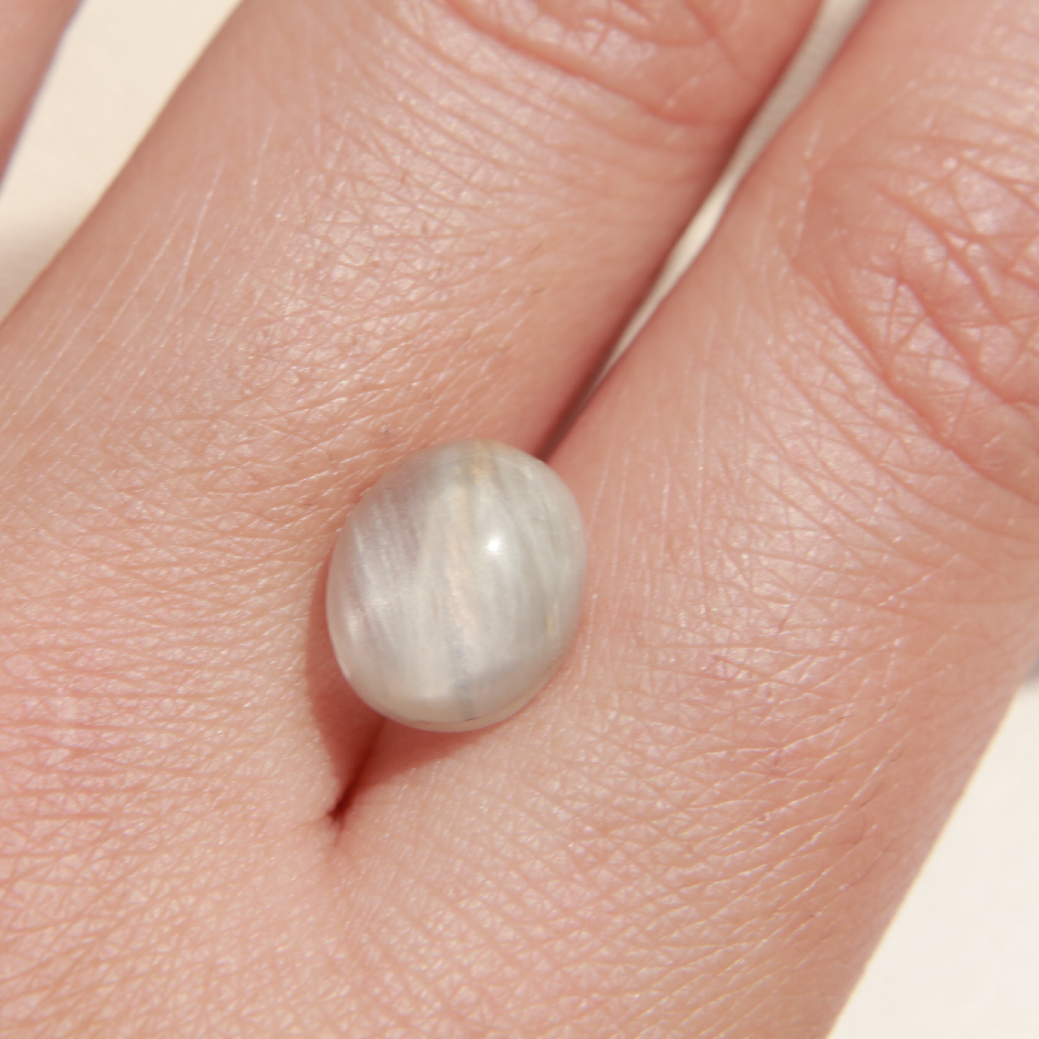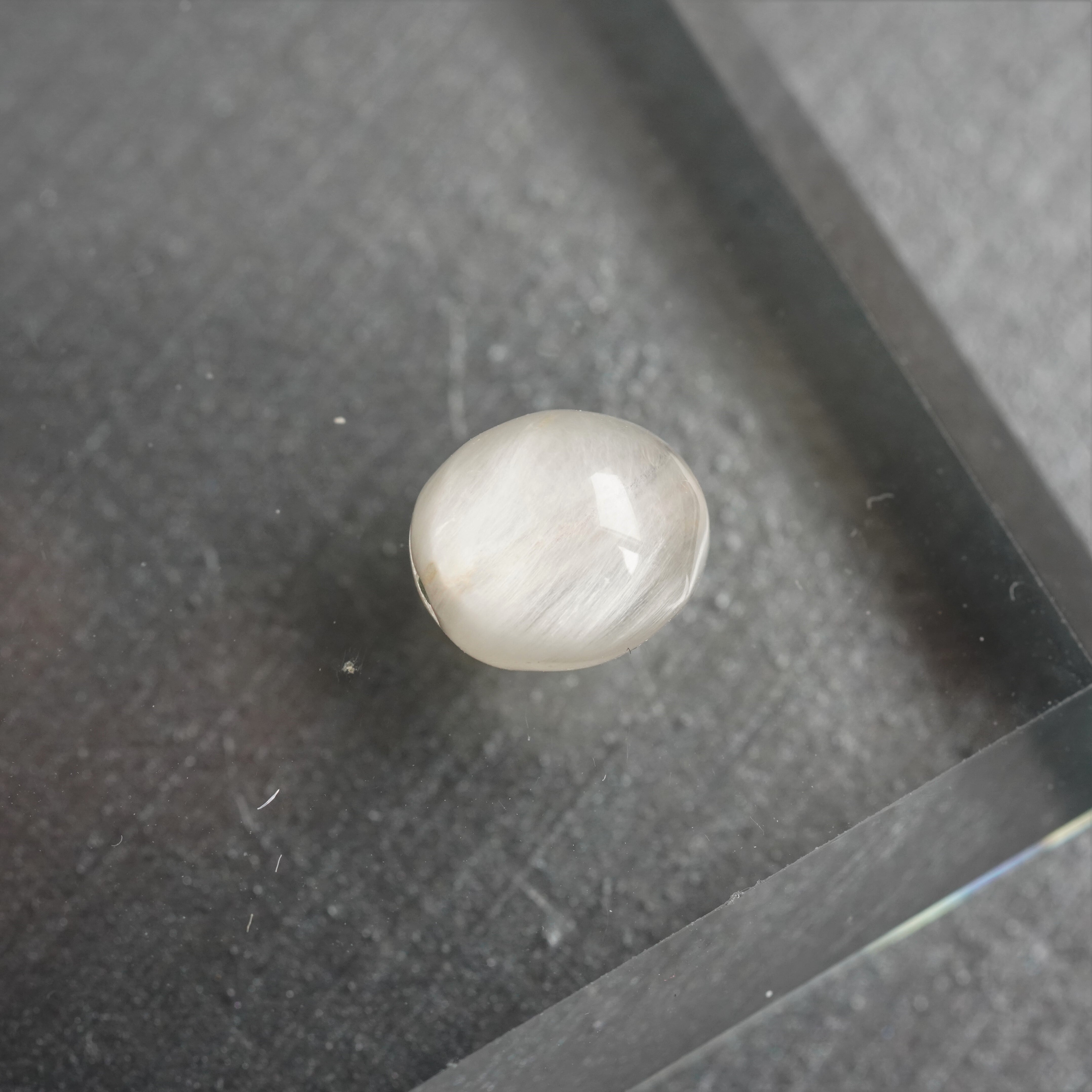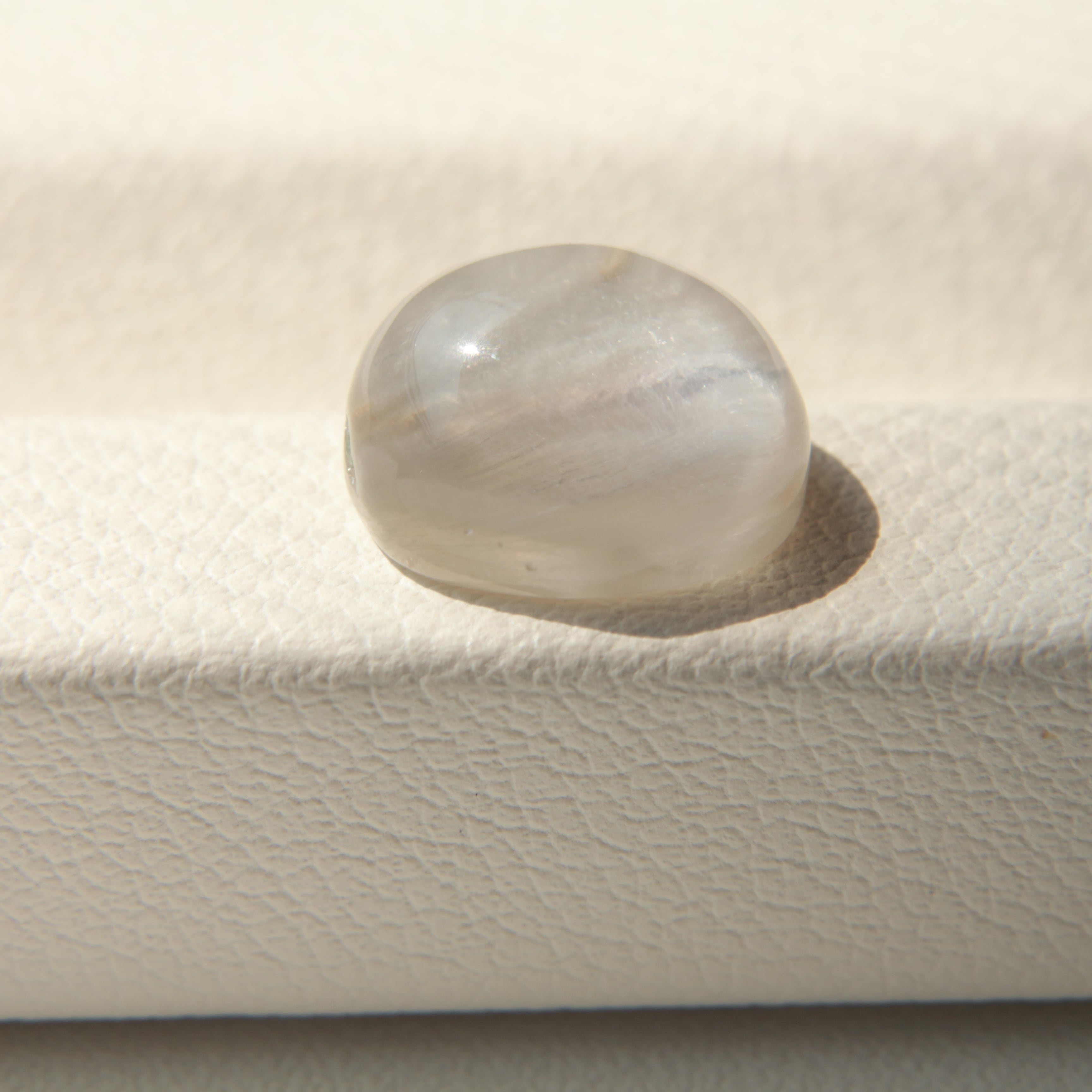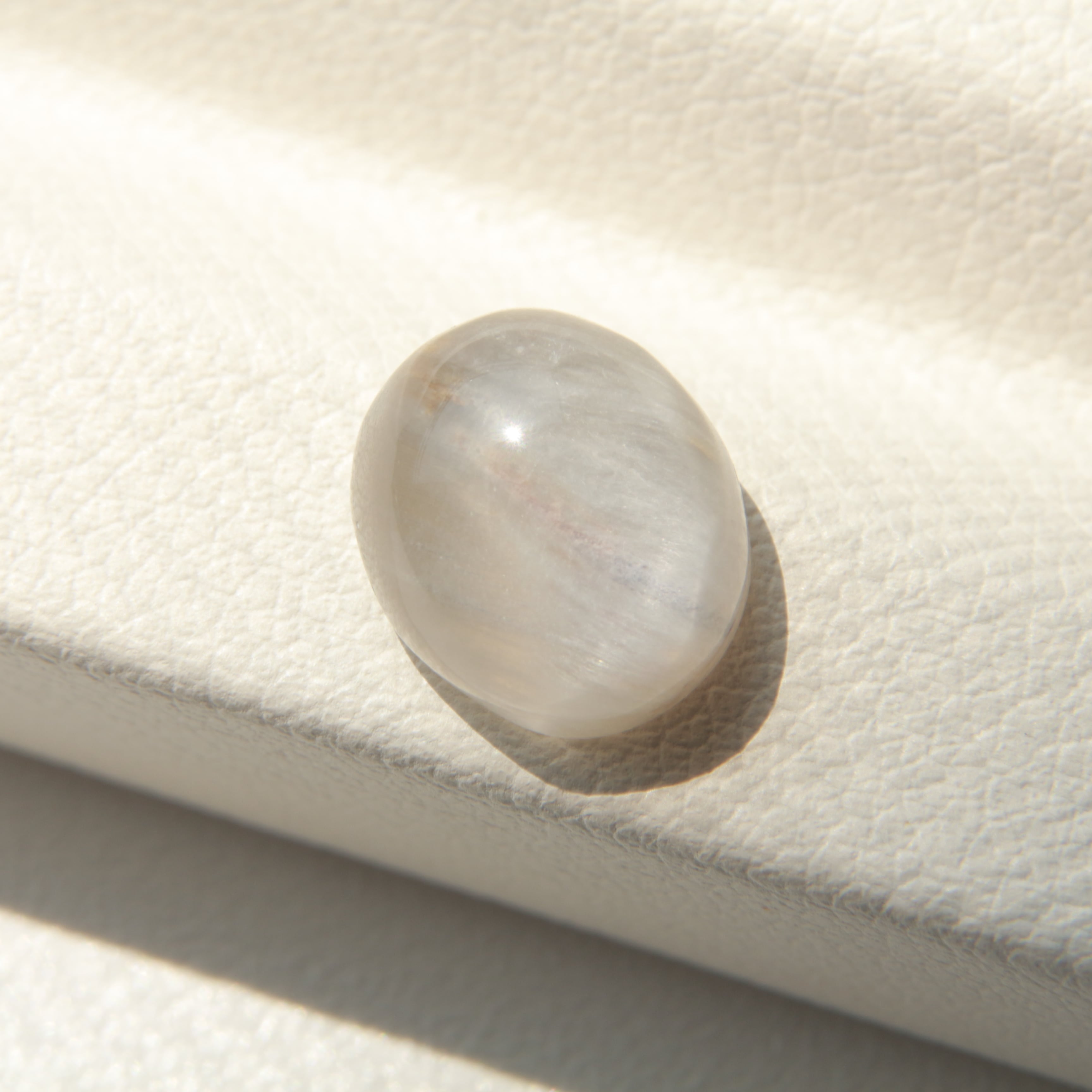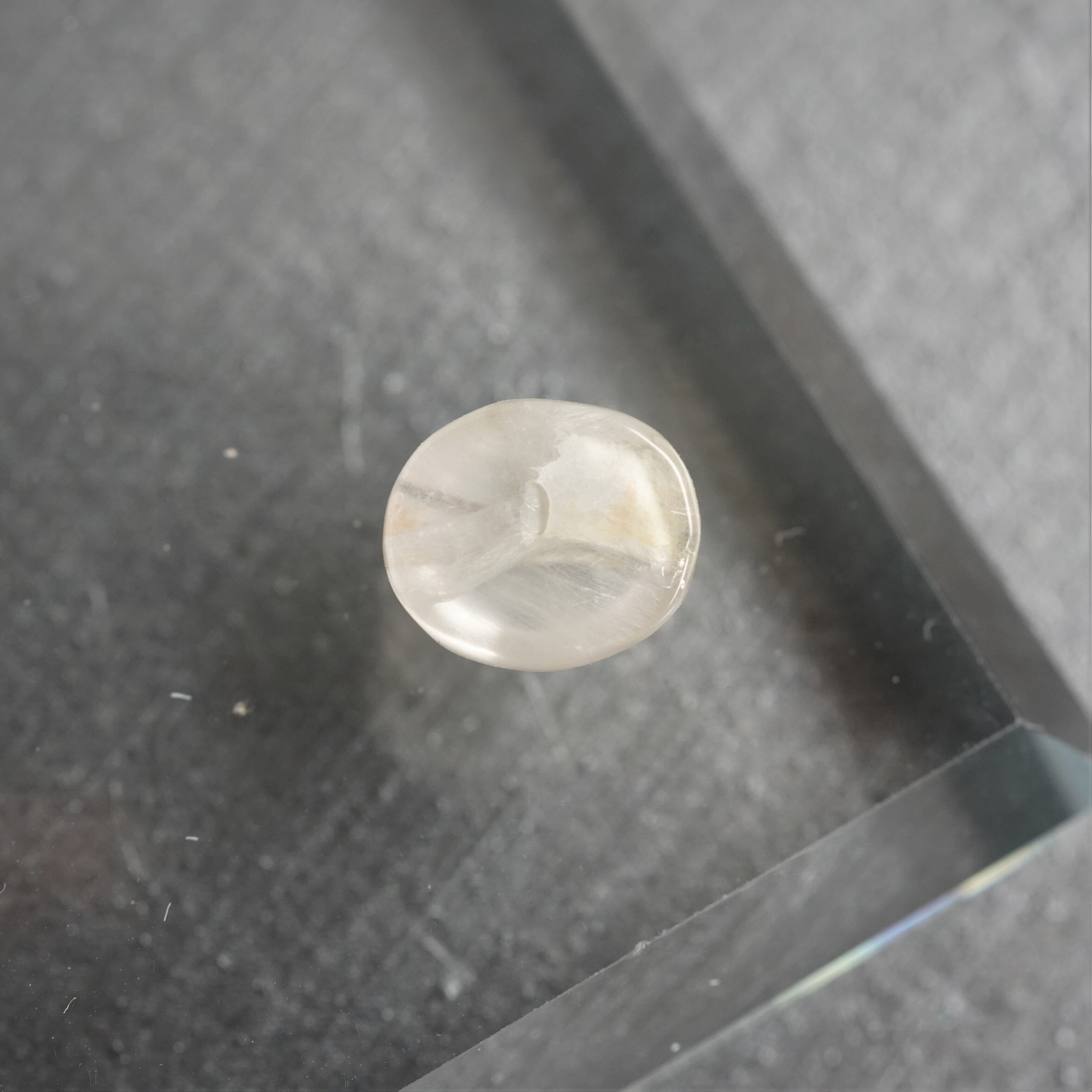 透明感のあるクォーツの中に、ホワイト系のアンフィボールインクルージョンがやわらかく広がる、やや小粒サイズのカボションルースです。全体的に淡く優しい色合いで、ふんわりとした印象が魅力です。