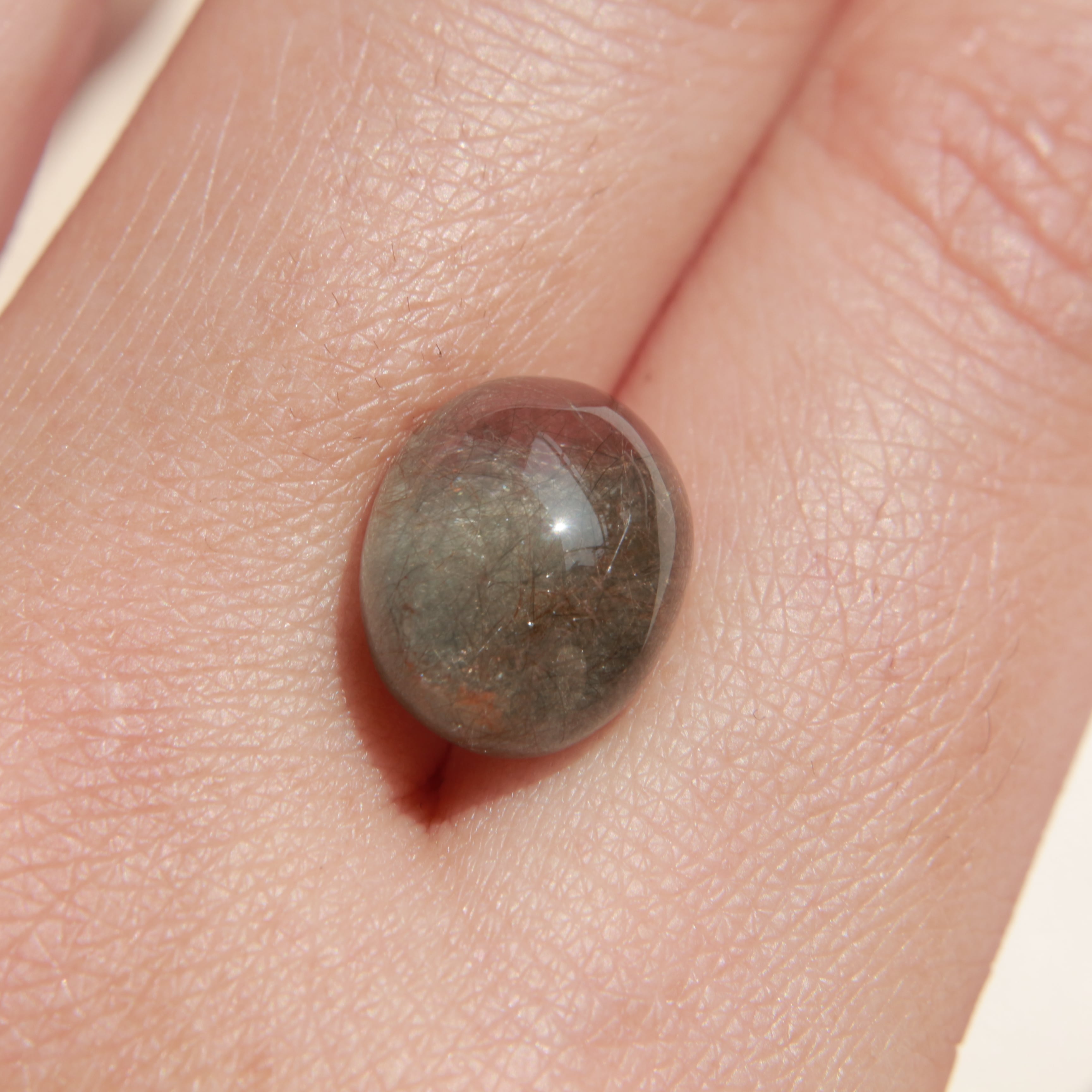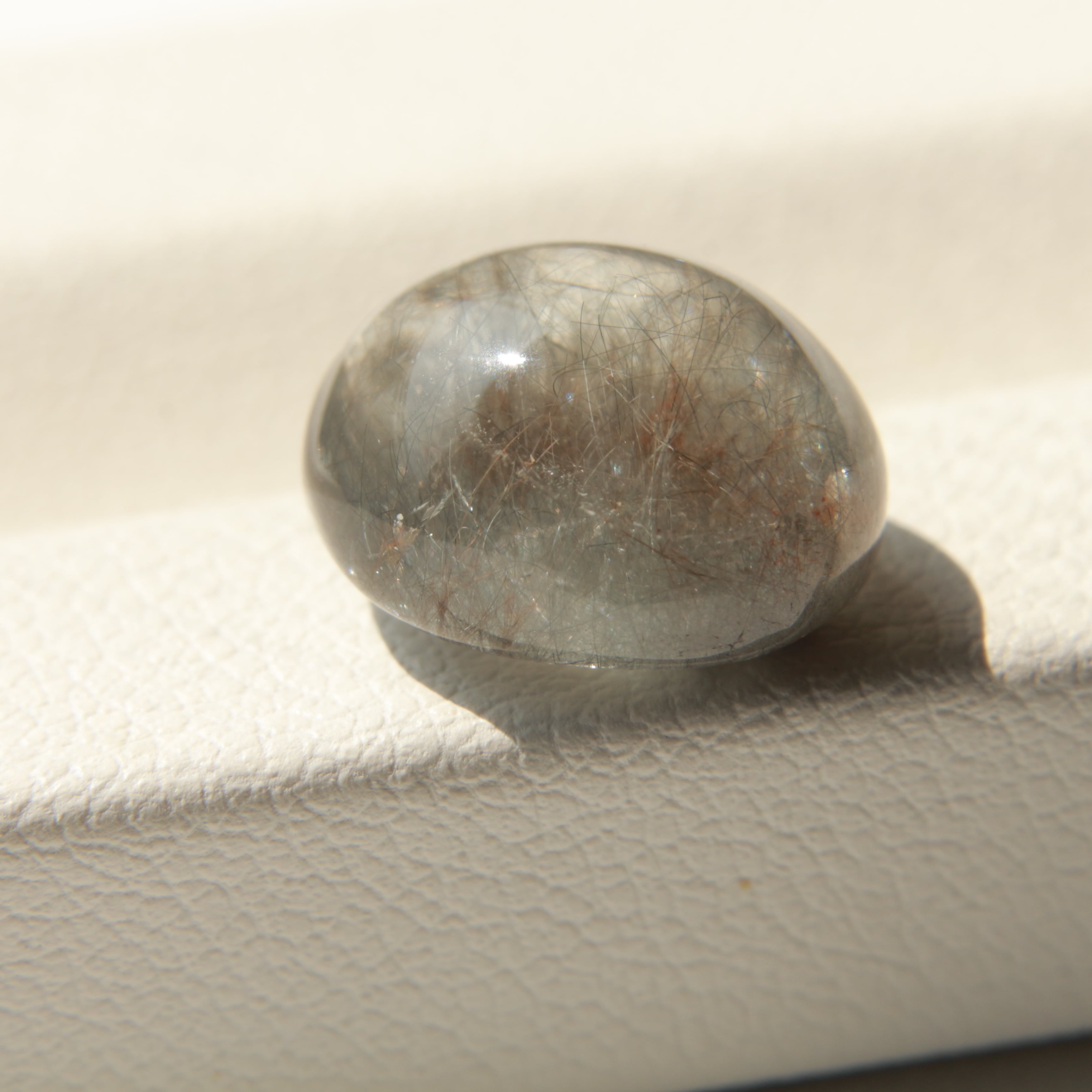 透明感のあるクォーツの内部に、グレーブルーのアンフィボールインクルージョンが漂う神秘的なカボションルースです。落ち着いた深みのある色合いは、幻想的な印象を与えます。