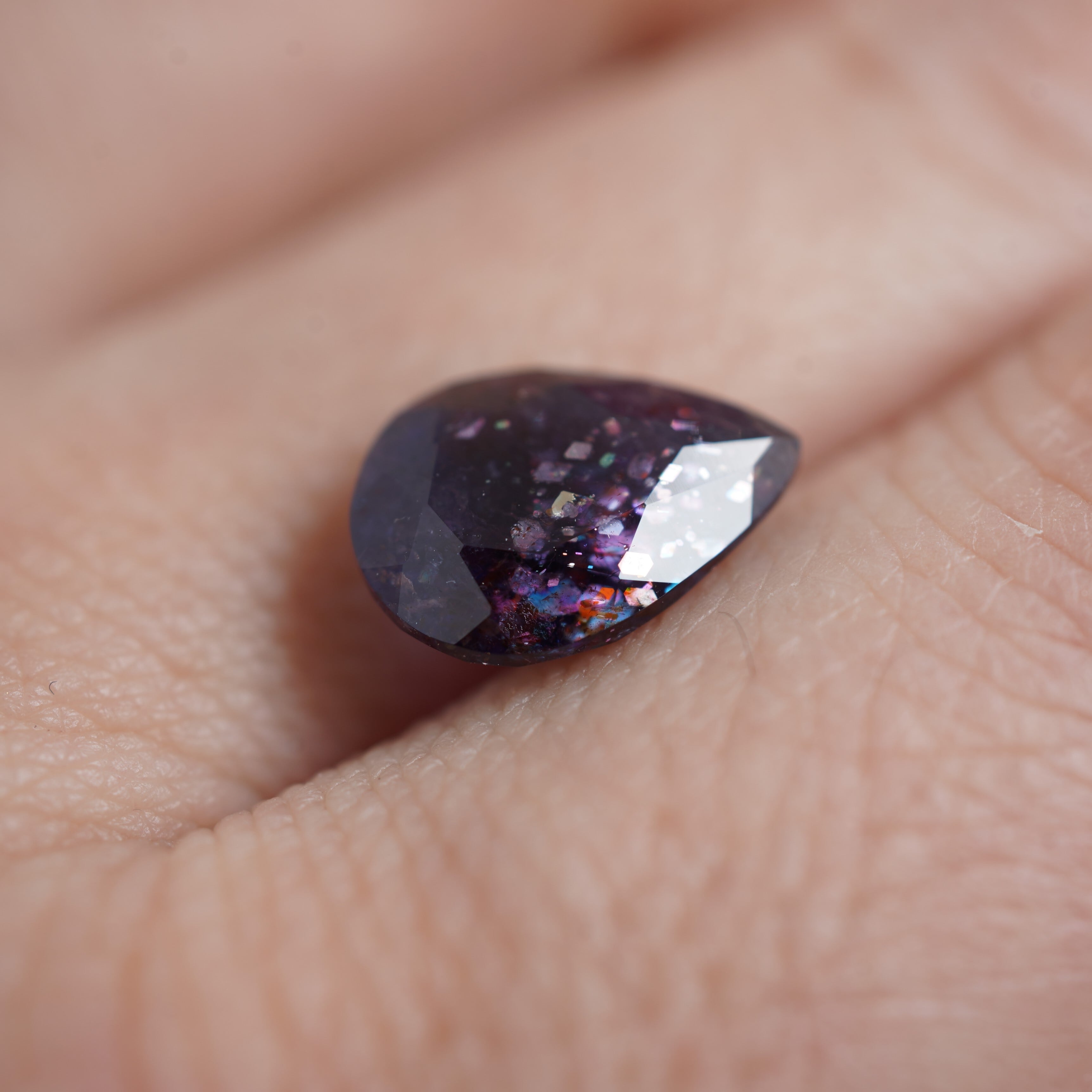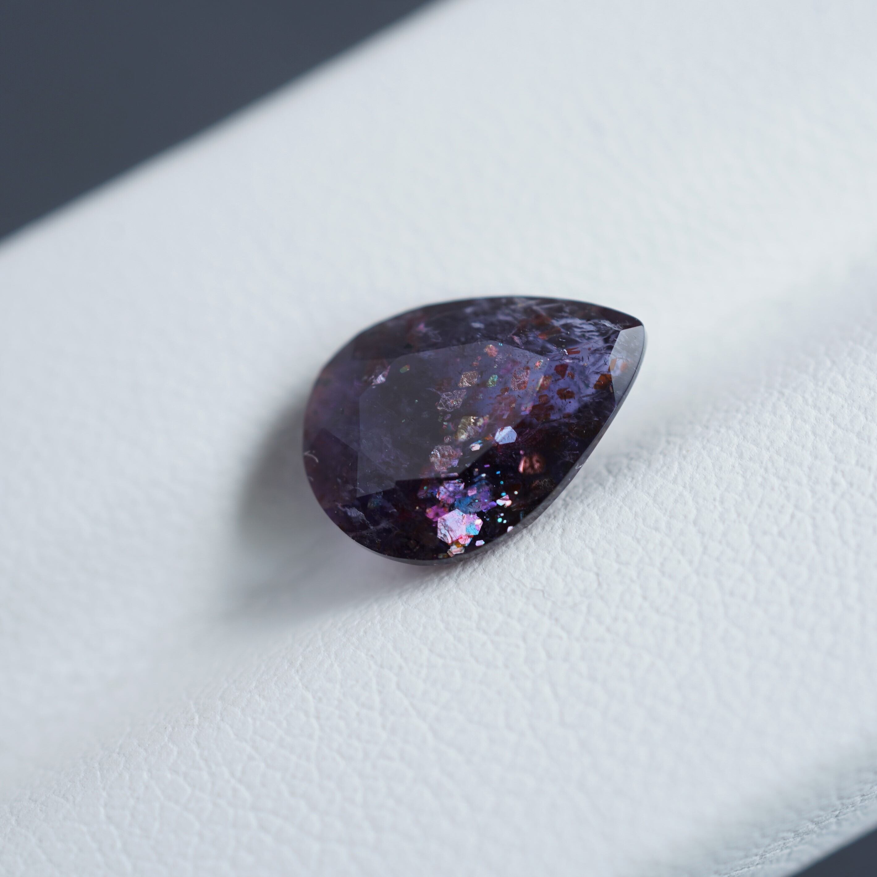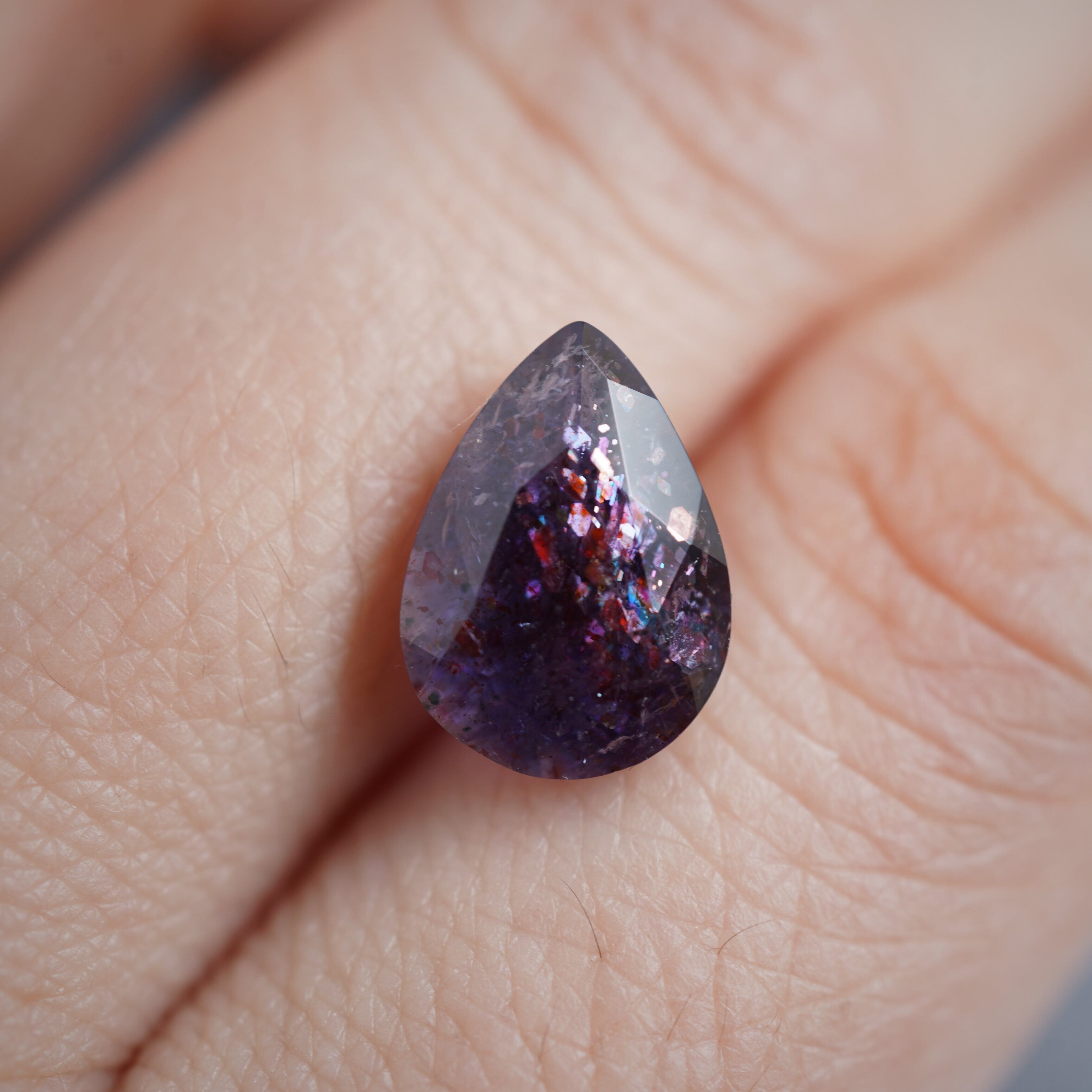 内包物は主にレピドクロサイトだといわれています。ラメのような光学効果が見られ、赤い斑点のような模様が見えるものが「ブラッドショット」と呼ばれています。夜空の魅力を詰め込んだような宝石です。
