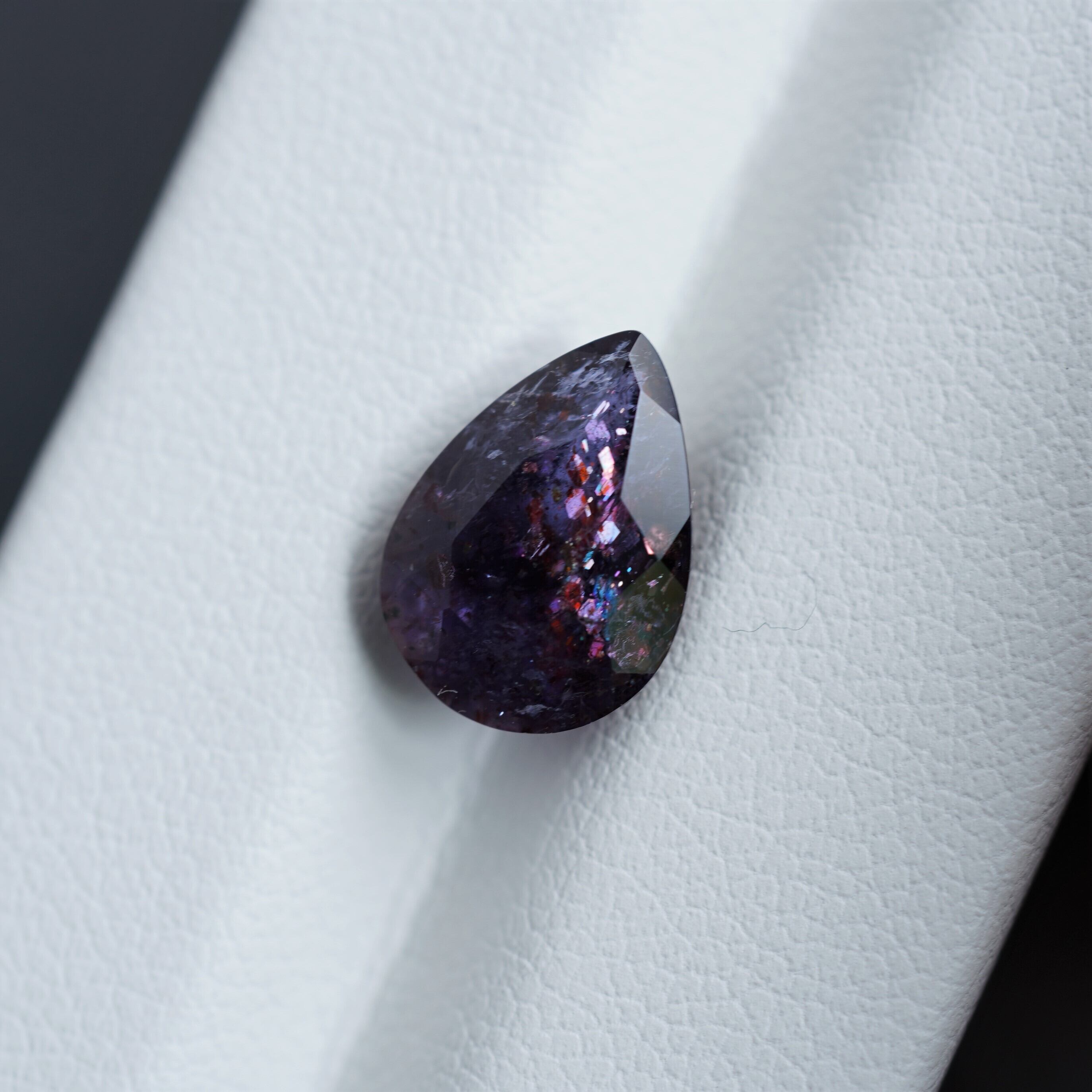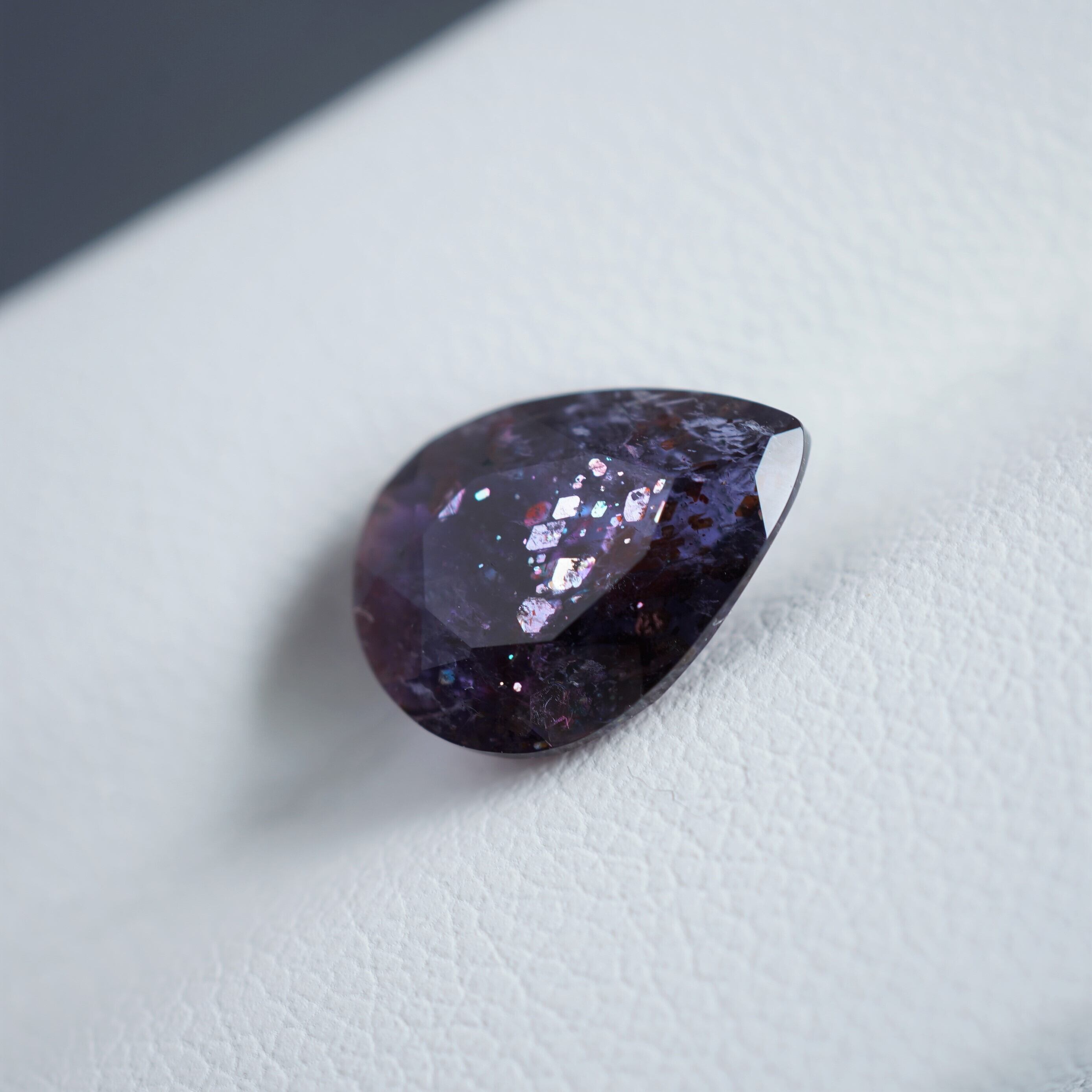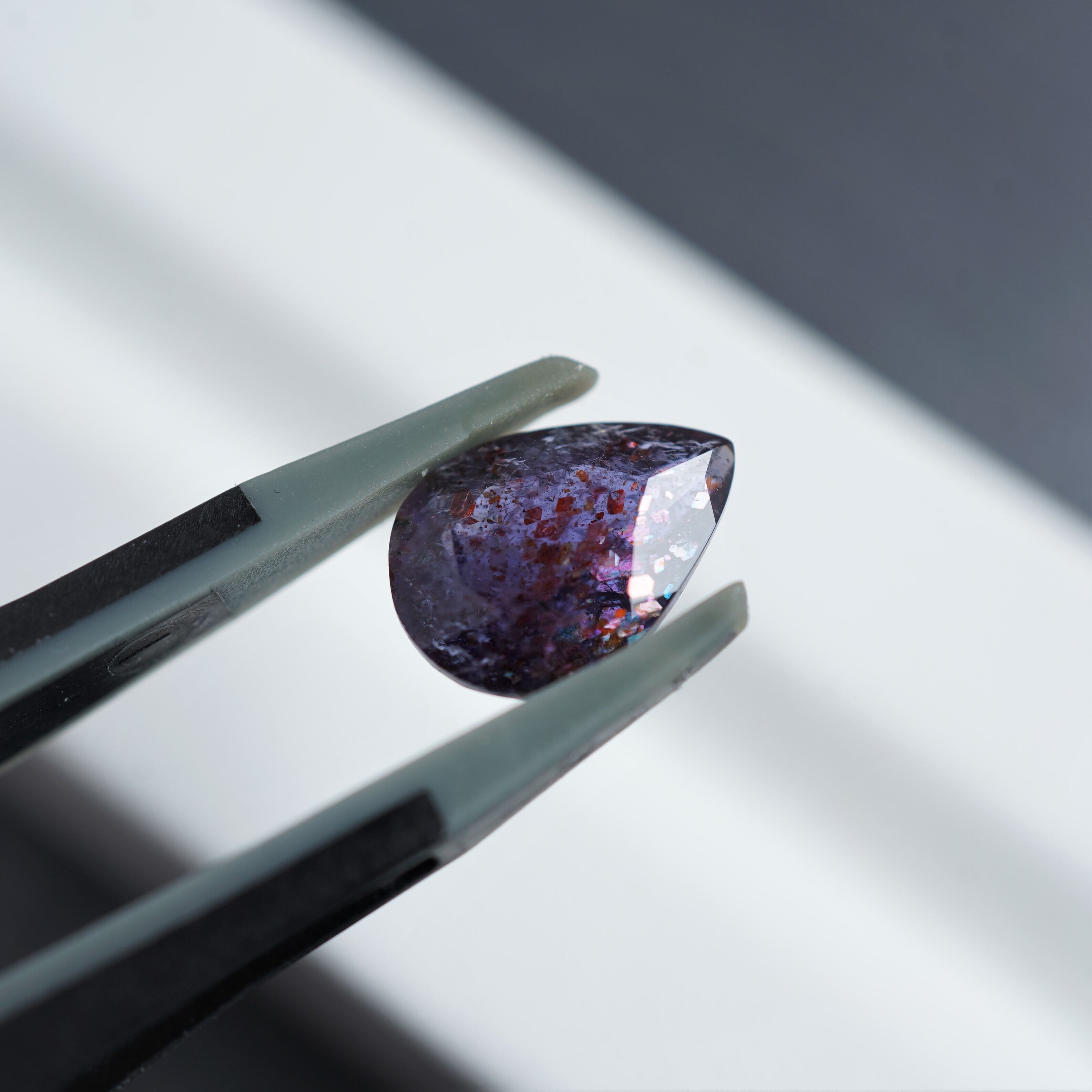 内包物は主にレピドクロサイトだといわれています。ラメのような光学効果が見られ、赤い斑点のような模様が見えるものが「ブラッドショット」と呼ばれています。夜空の魅力を詰め込んだような宝石です。