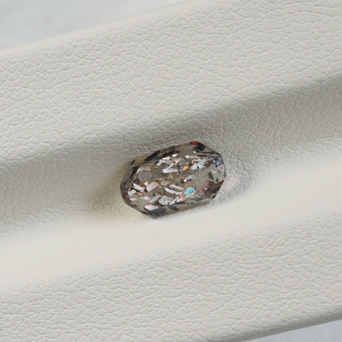 内部に赤鉄鉱とチタン鉄鉱が格子状の内包物が含まれている状態に限って、ラティスの模様が見えることから、“レインボーラティスサンストーン”と呼ばれています。