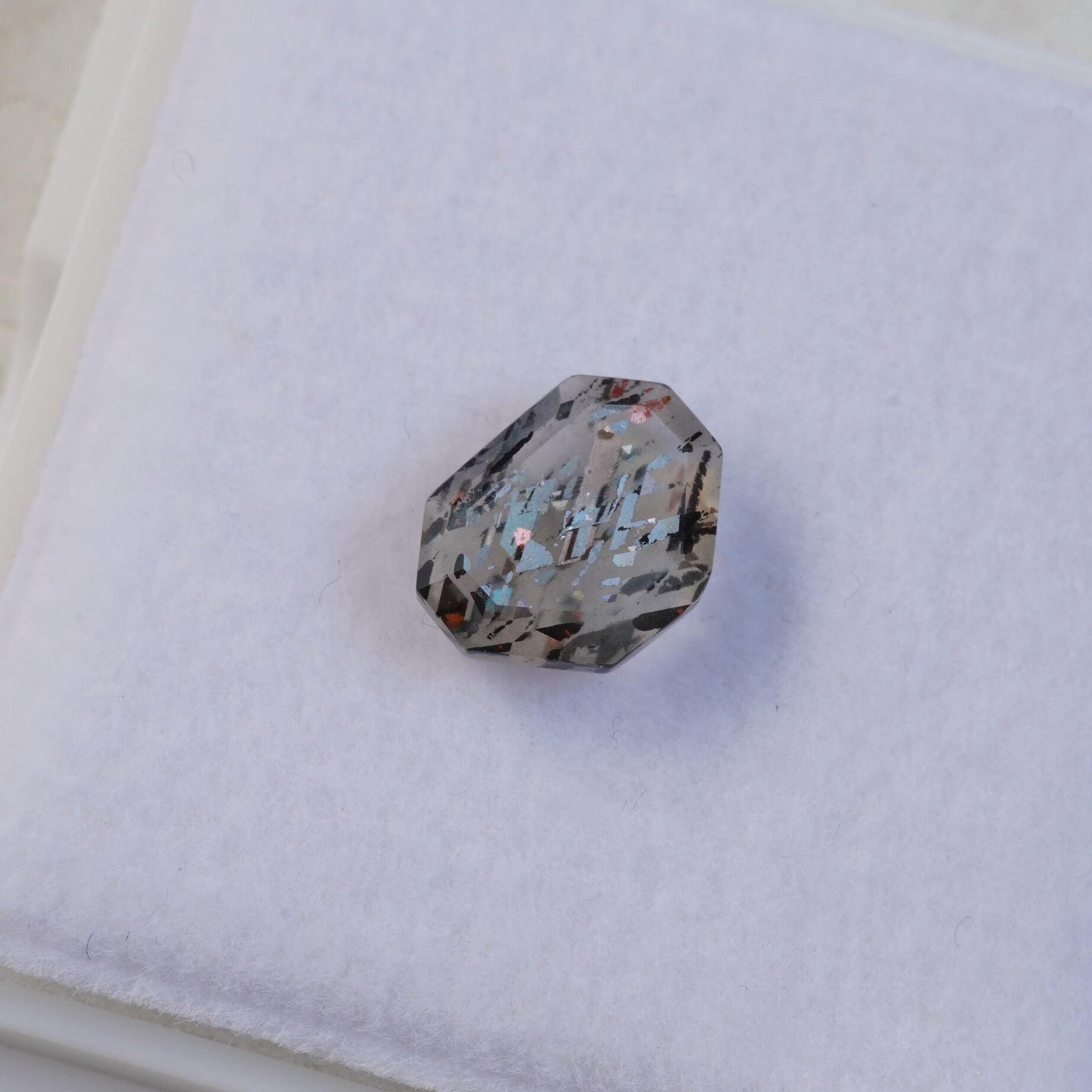 内部に赤鉄鉱とチタン鉄鉱が格子状の内包物が含まれている状態に限って、ラティスの模様が見えることから、“レインボーラティスサンストーン”と呼ばれています。